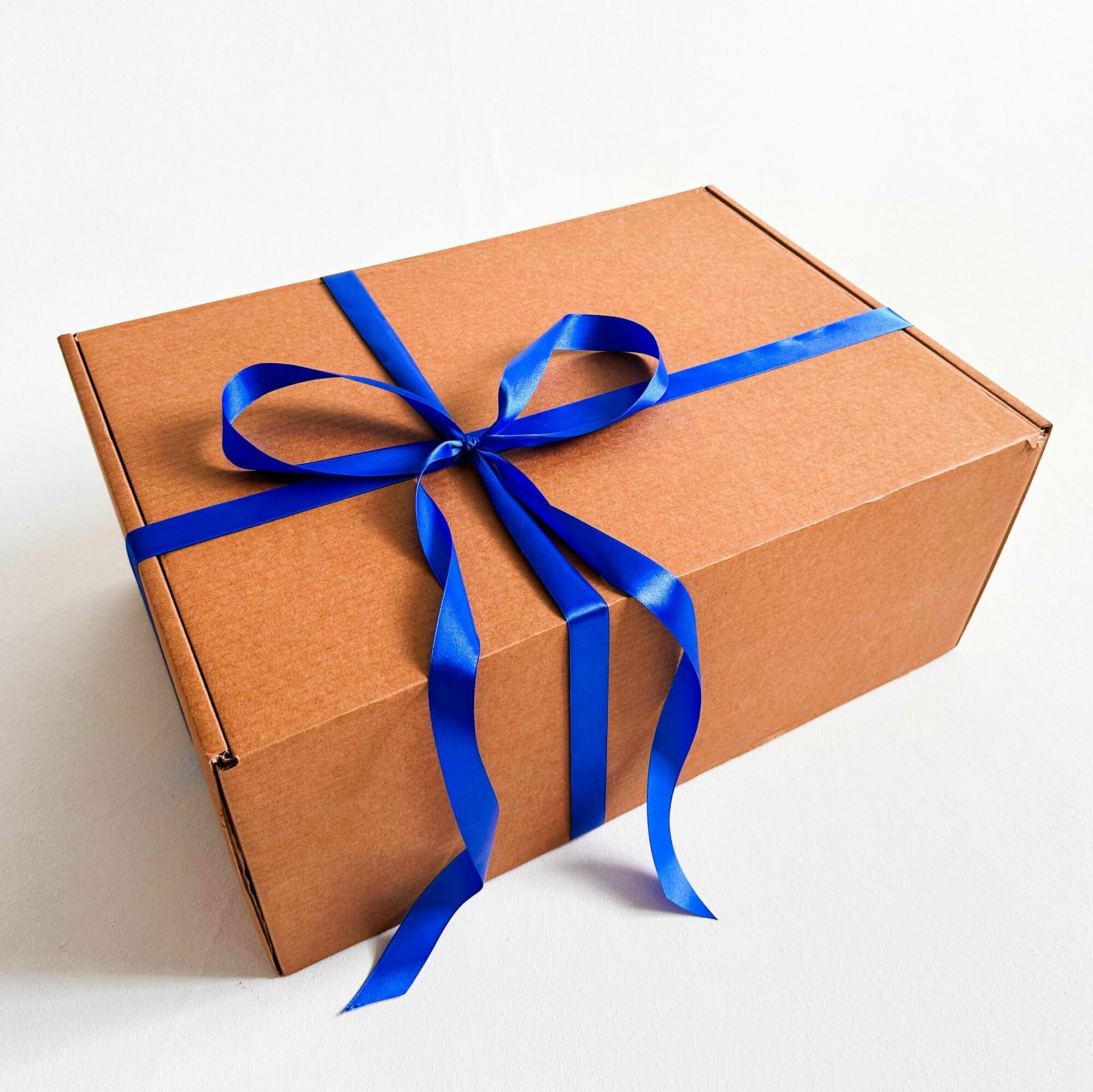 Большая подарочная коробка GILEV 44x32x15см с синей лентой и наполнителем крафт 999 ₽