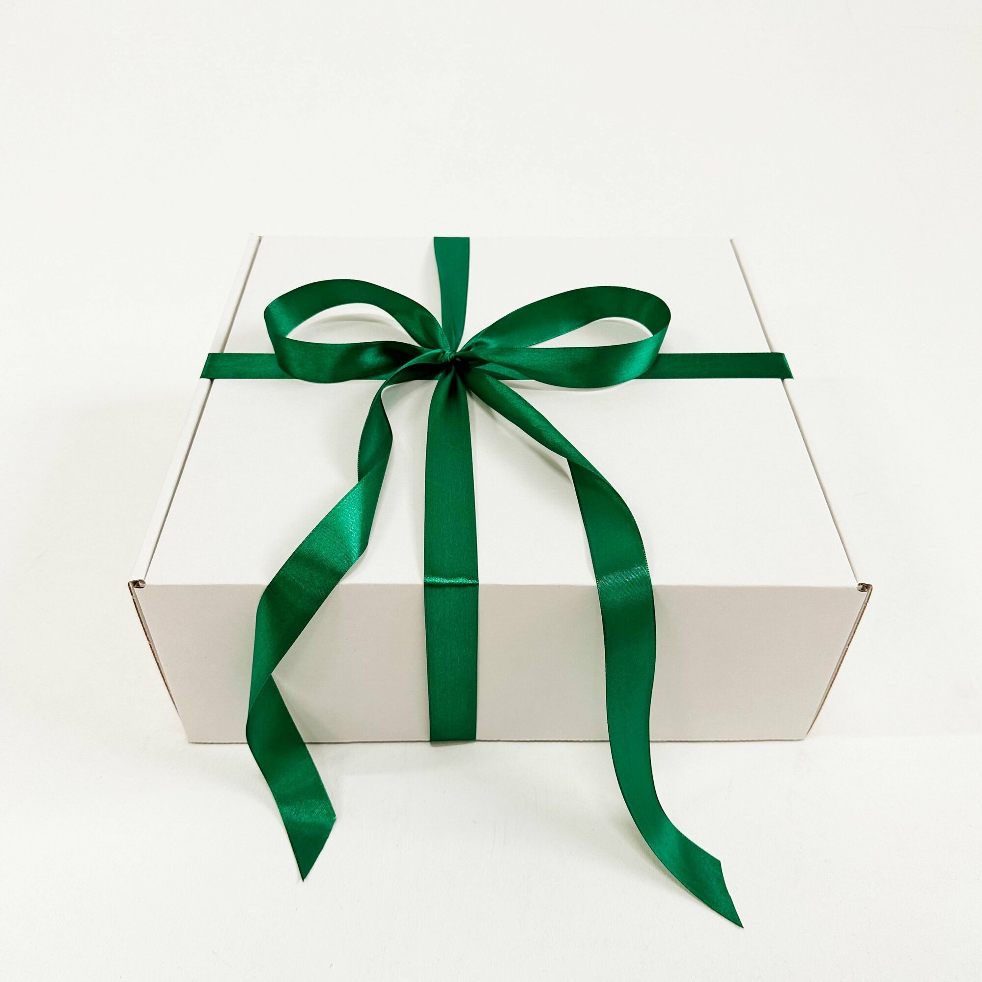Белая подарочная коробка GILEV 32x32x12см с зеленой лентой и наполнителем 551 ₽