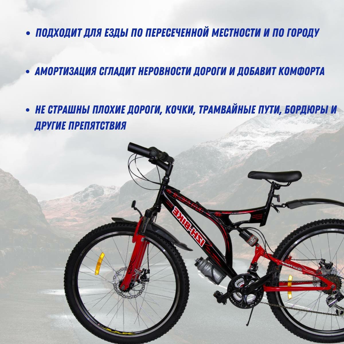 | Особенности велосипеда | амортизационный подседельный штырь, двойной обод, седло с пружинами, телескопический штырь |