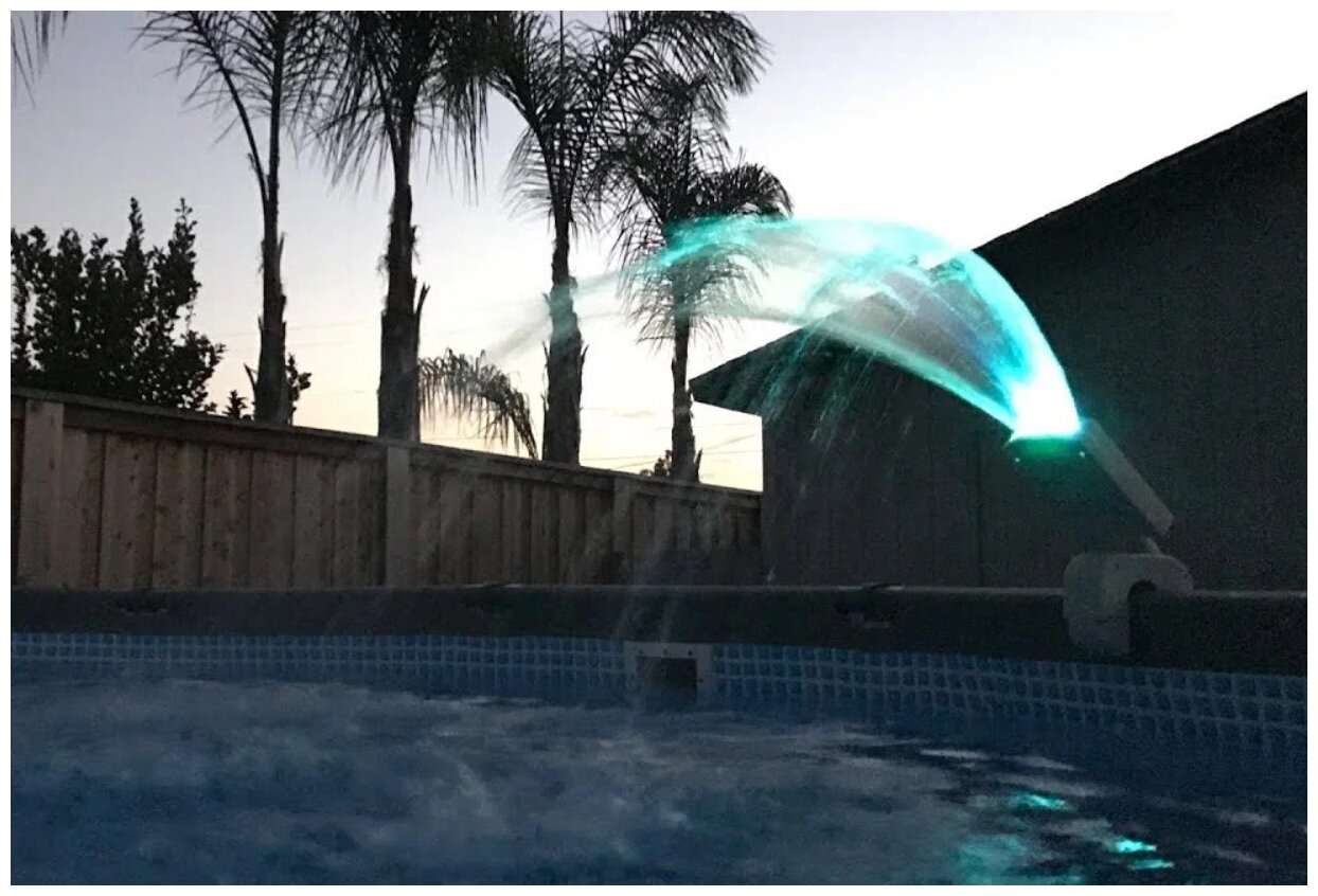 | Дополнительная информация | крепление к каркасу бассейна в комплекте подходит для любого каркасного бассейна; LED-подсветка горит белым, красным, синим и зелёным цветами; подсветка обеспечивается встроенным гидрогенератором, вырабатывающим электричество за счет потока поступающего от насоса потока воды; утройство подключается шлангом 38 мм с резьбовым соединением (в комплекте переходник для соединения шланга 32 мм.); для нормальной работы требуется фильтрующий насос производительностью: от 3785 до 11355 л/ч |