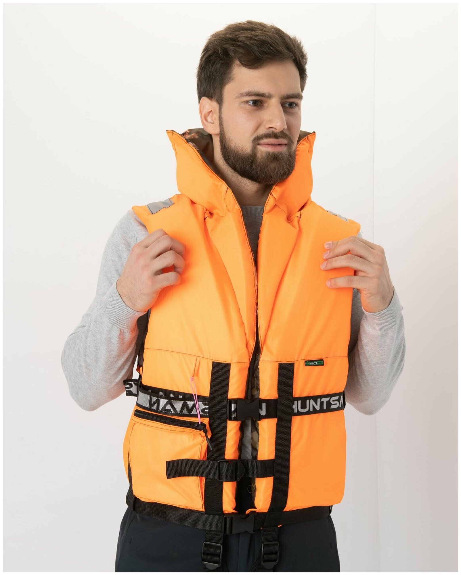 10 цен на Спасательный жилет взрослый двусторонний Huntsman ПР с карманами, светоотражателями: сертификат гимс, ГОСТ, цвет оранжевый/лес (р.44-48/60 кг)