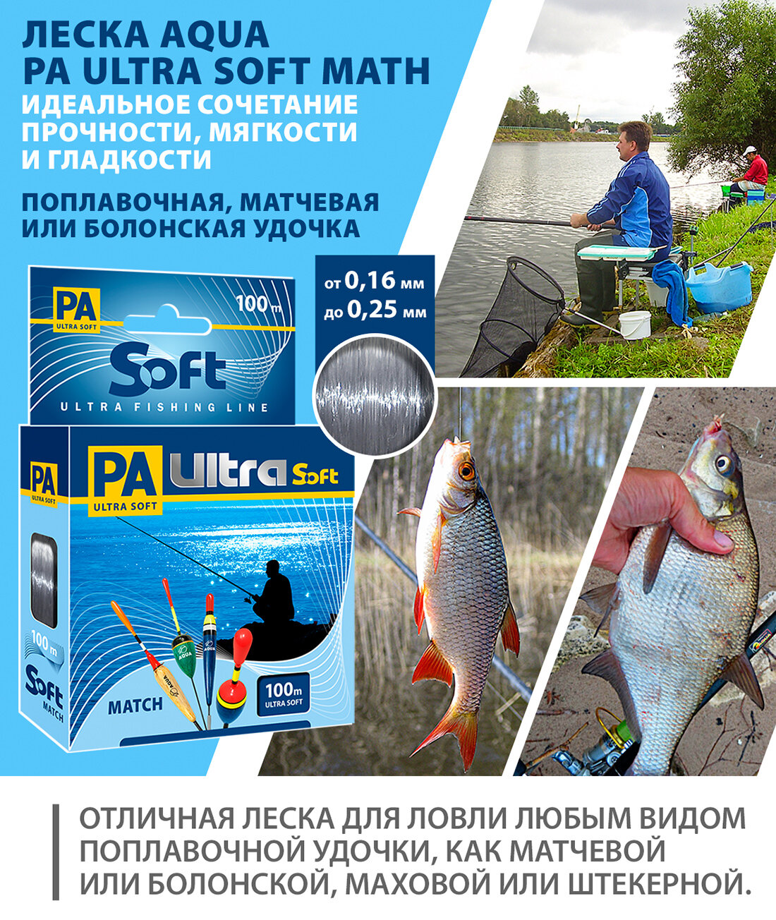 | Дополнительная информация | Монофильная рыболовная леска на удочку, спиннинг, фидер |