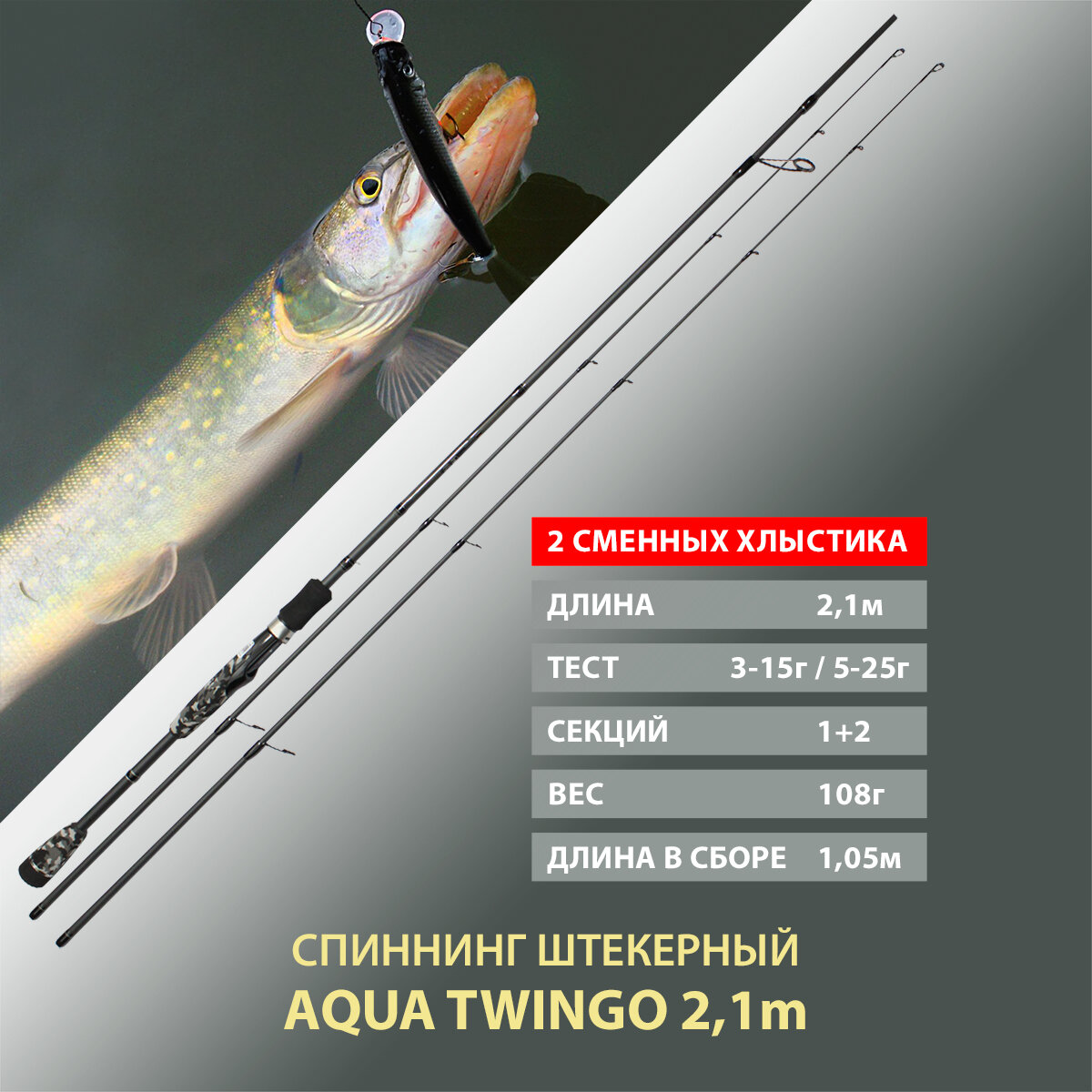 10 цен на Спиннинг штекерный, с двумя хлыстами AQUA Twingo, длина 2,10 метра, тест 3-15 грамм/05-25 грамм