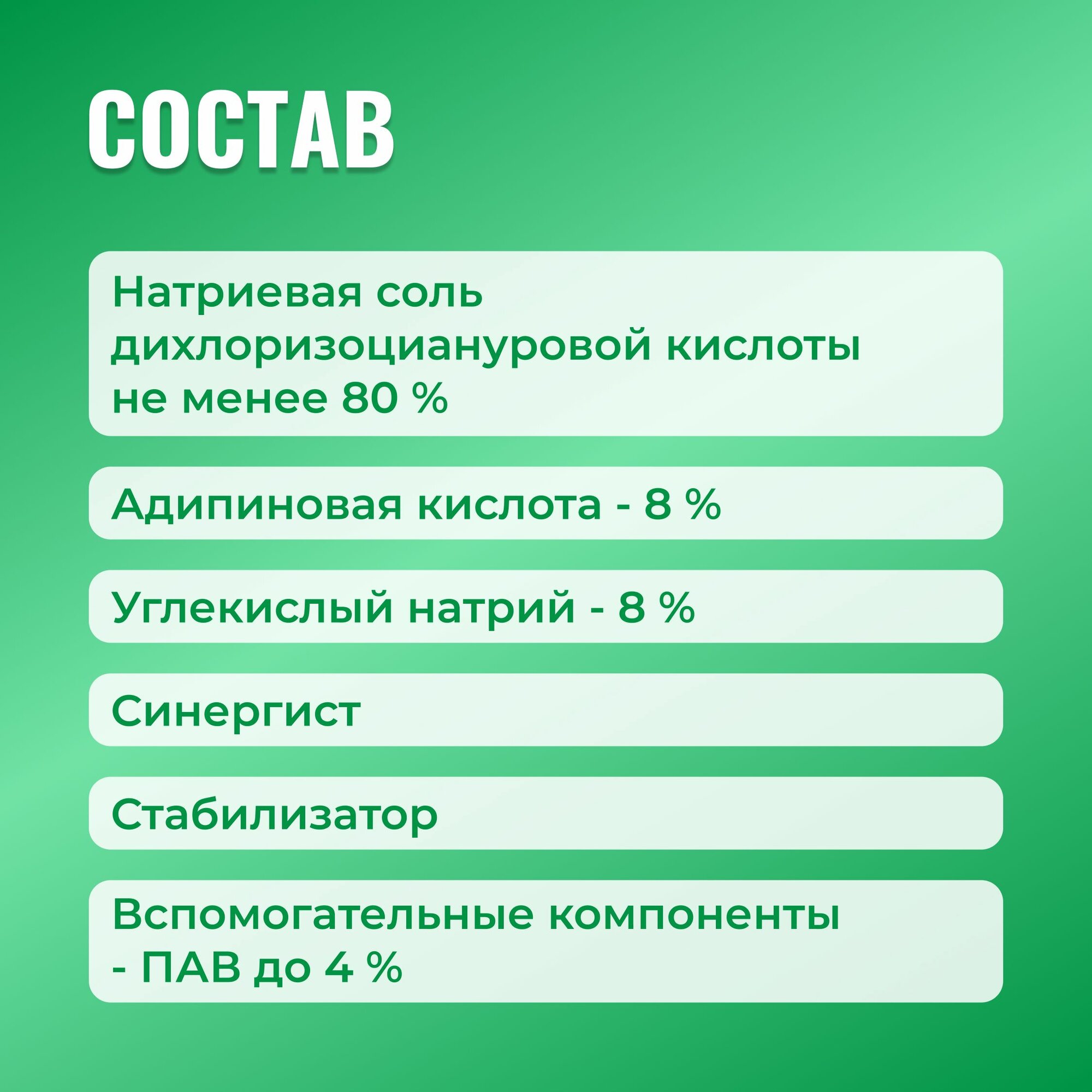 | Состав | адипиновая кислота 8%, углекислый натрий 8%, синергист, стабилизатор, вспомогательные компоненты – ПАВ (без контросодержания в препарате) до 4%, массовая доля активного хлора в таблетках не менее 44% |