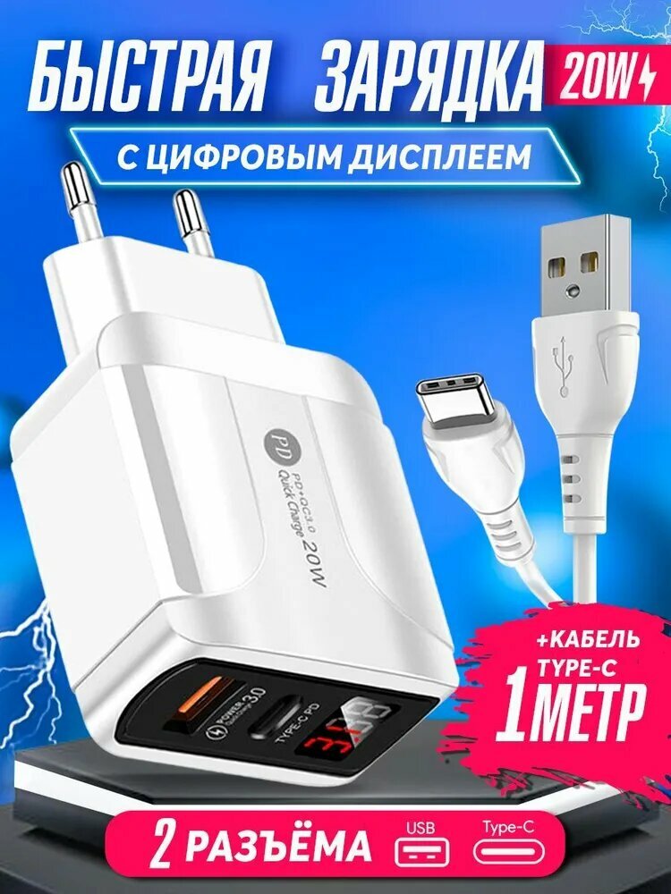 Отзывы на Зарядное устройство для телефона 1USB+PD20W с LED дисплеем, кабель TYPE-C 1 м, быстрая зарядка для iphone, samsung, honor, xiaomi, realme, белая
