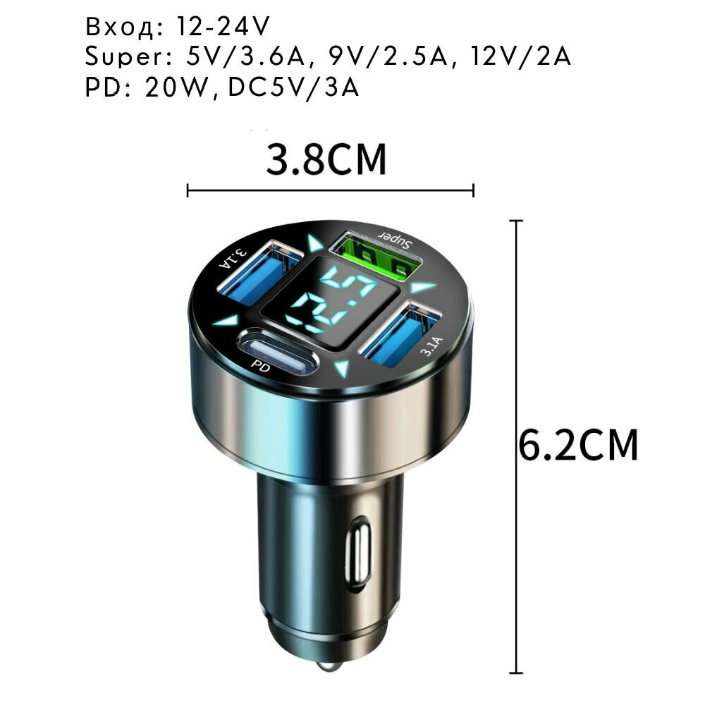 Автомобильная зарядка быстрая USB_Super+3.1A+PD с вольтметром информация: