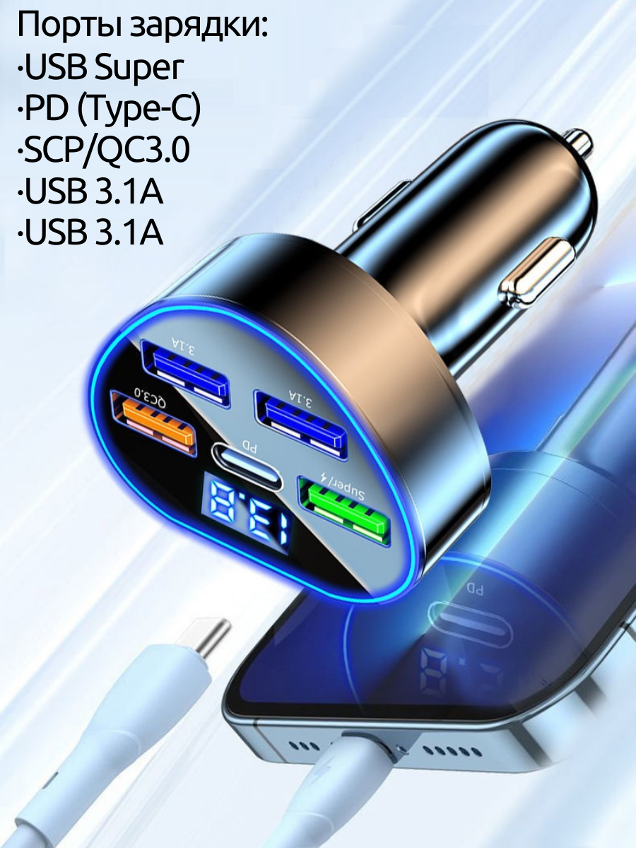 Автомобильная зарядка быстрая USB_Super+3.1A+PD с вольтметром 625 ₽