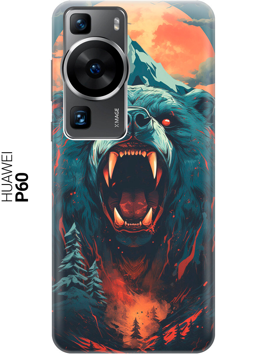 10 цен на Силиконовый чехол на Huawei P60 / Хуавей П60 с рисунком "Гризли при красной луне"
