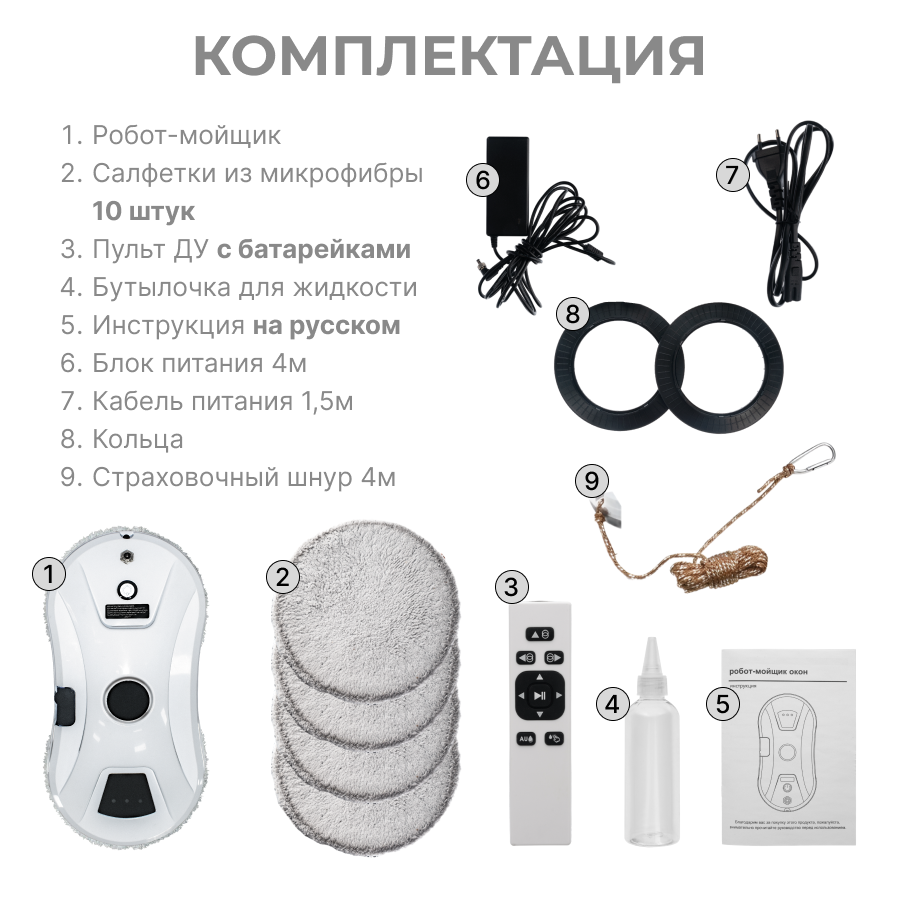 | В комплекте | зарядное устройство, моющая тряпка, пульт ДУ, страховочный шнур, фиксирующее кольцо |