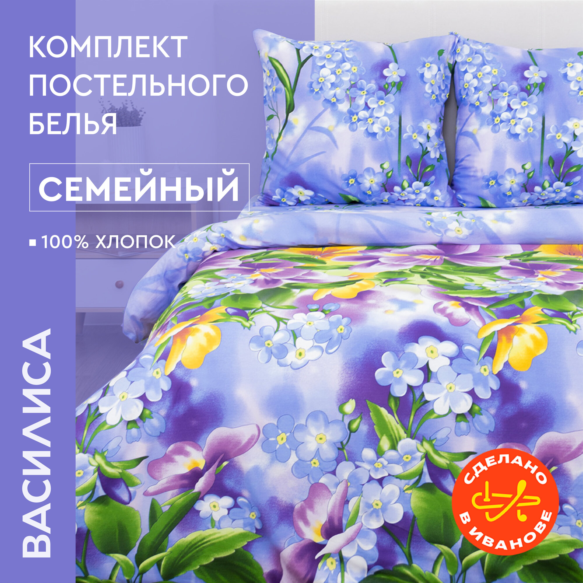 Постельное белье Василиса Семейное, Бязь, наволочки 70х70 см, Фиалки информация: