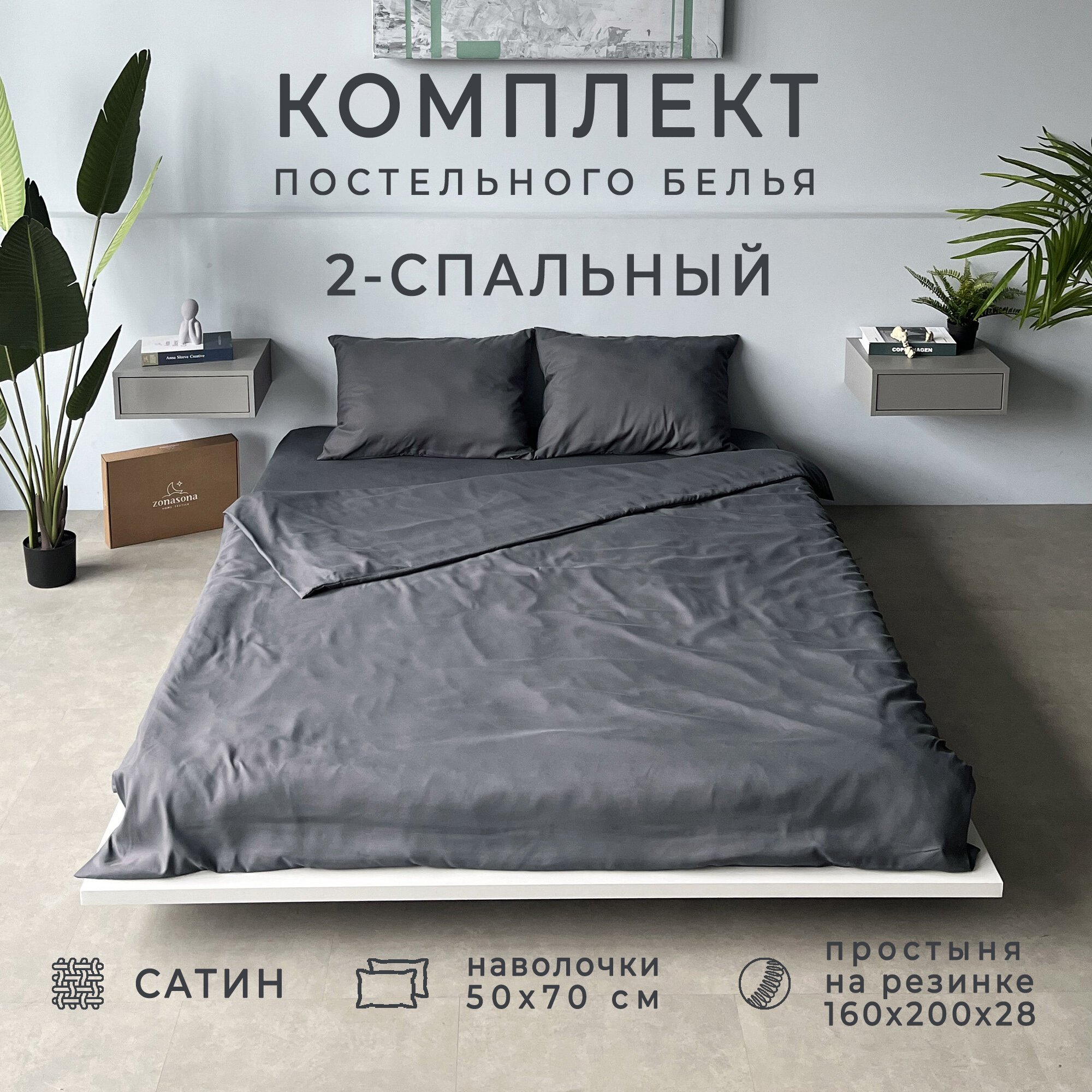 Комплект постельного белья ZonaSona с простыней на резинке, Графит, 2 спальный, сатин, наволочки 50х70 2 шт. информация: