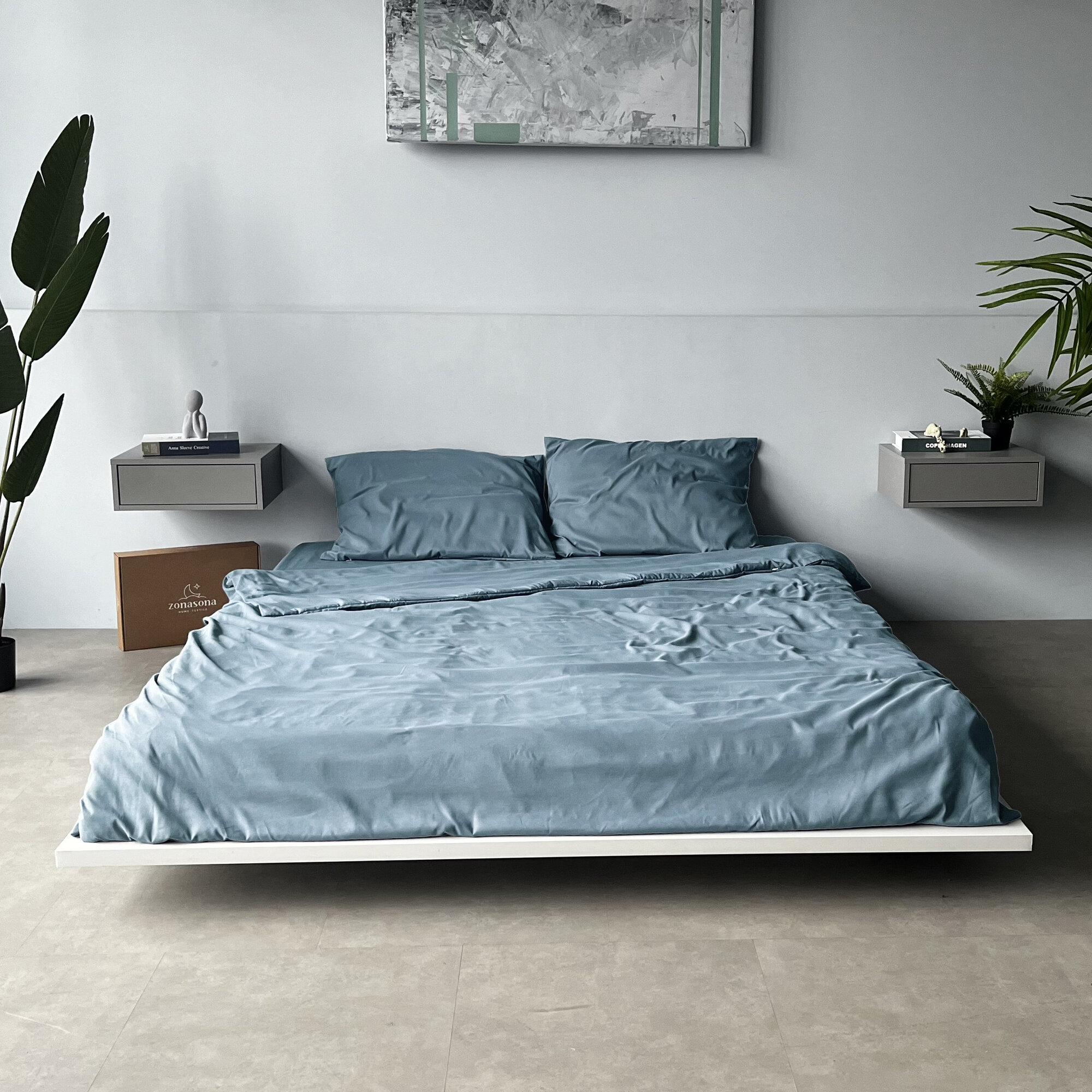 Комплект постельного белья ZonaSona с простыней на резинке, Серо-Голубой, 2 спальный, сатин, наволочки 50х70 2 шт. 2 950 ₽