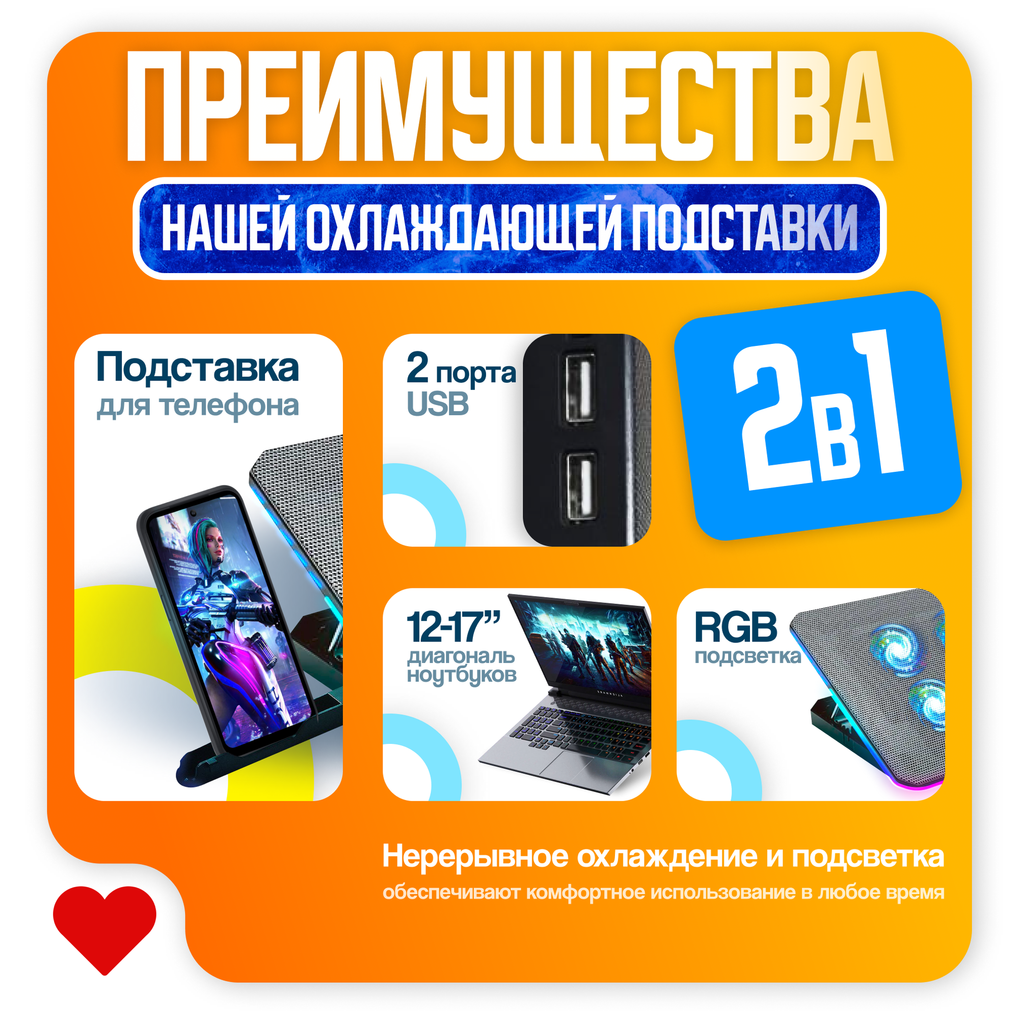 Регулируемая охлаждающая подставка для ноутбуков, 2 вентилятора, подсветка, 5 углов наклона, держатель для смартфона, 2 USB , для экрана 13"-19"