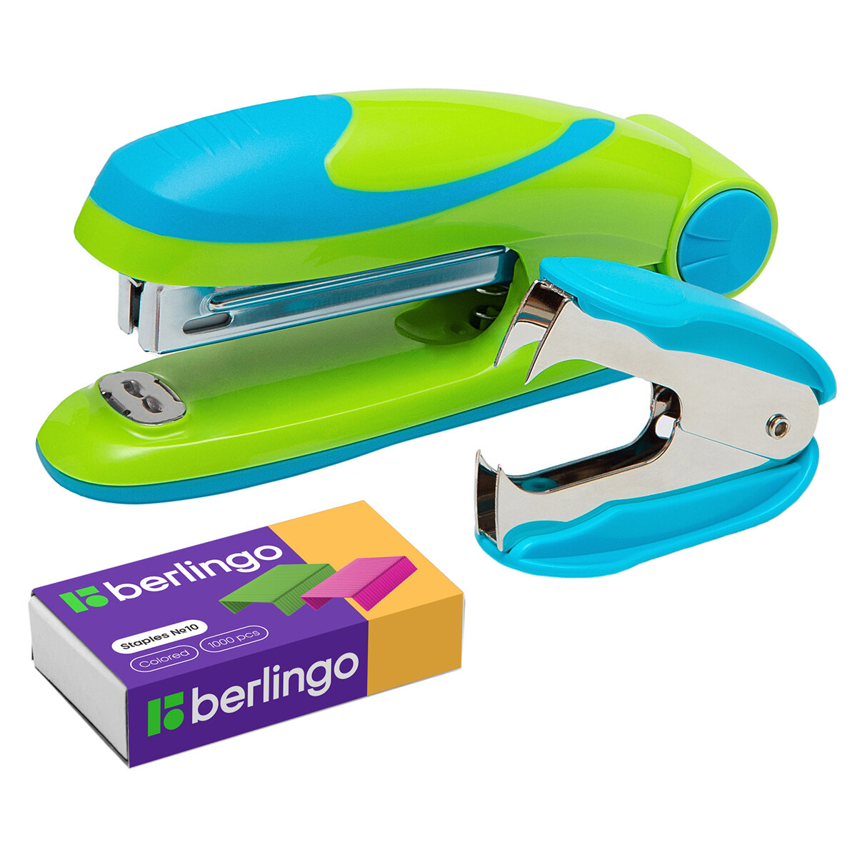 10 цен на Комплект 4 шт, Набор Berlingo "Fuze": степлер №10 до 15л., зеленый; антистеплер; скобы №10; блистер