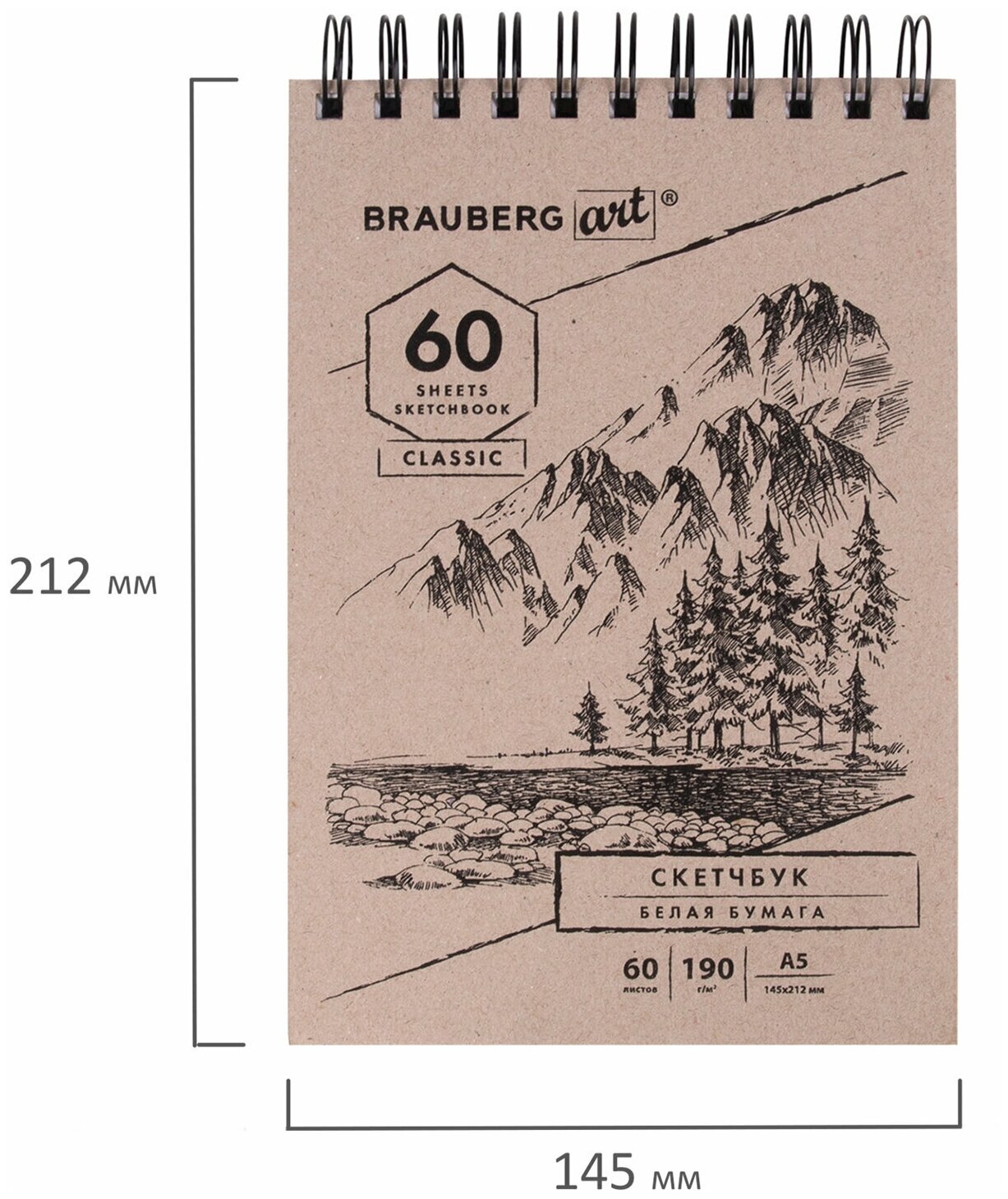 Скетчбук, белая бумага 190 г/м2, 297х210 мм, 60 л., гребень, твердая обложка, BRAUBERG ART CLASSIC, 113853