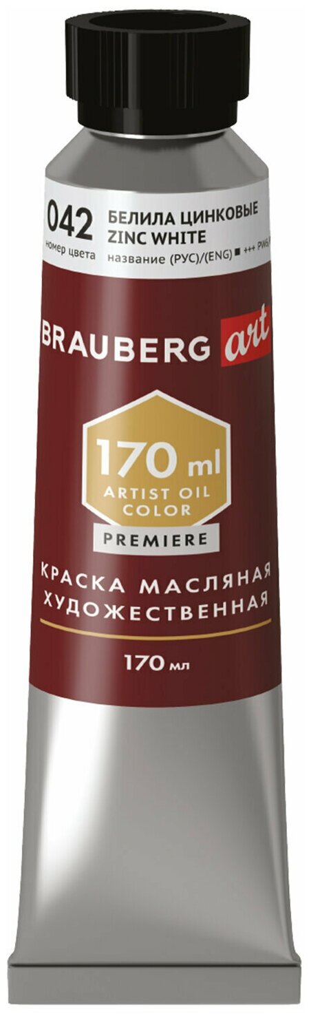 Краска масляная художественная BRAUBERG ART PREMIERE 170 мл, проф. серия, белила цинковые, 191395