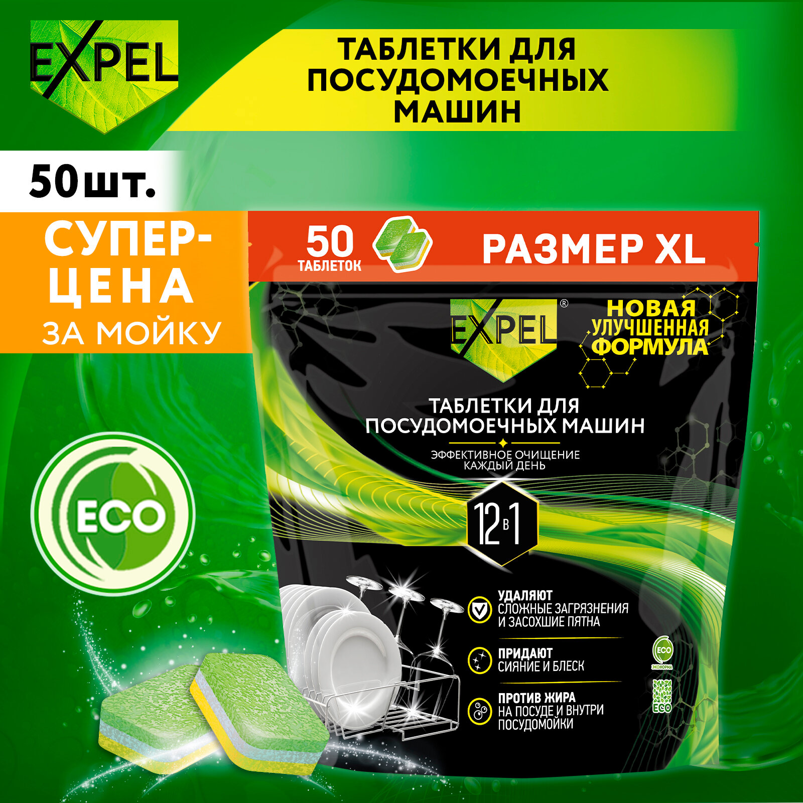 Таблетки для посудомоечной машины Expel, таблетки для ПММ 12 в 1 без запаха , 50 штук