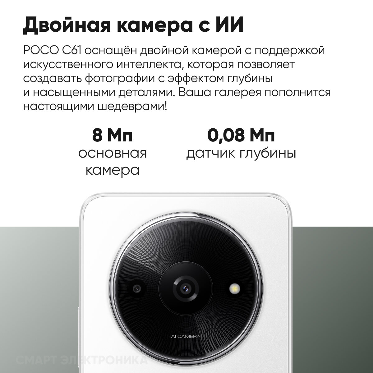 Смартфон POCO C61 4GB+128GB, White, Dual nano sim, RU Официальная гарантия. информация: