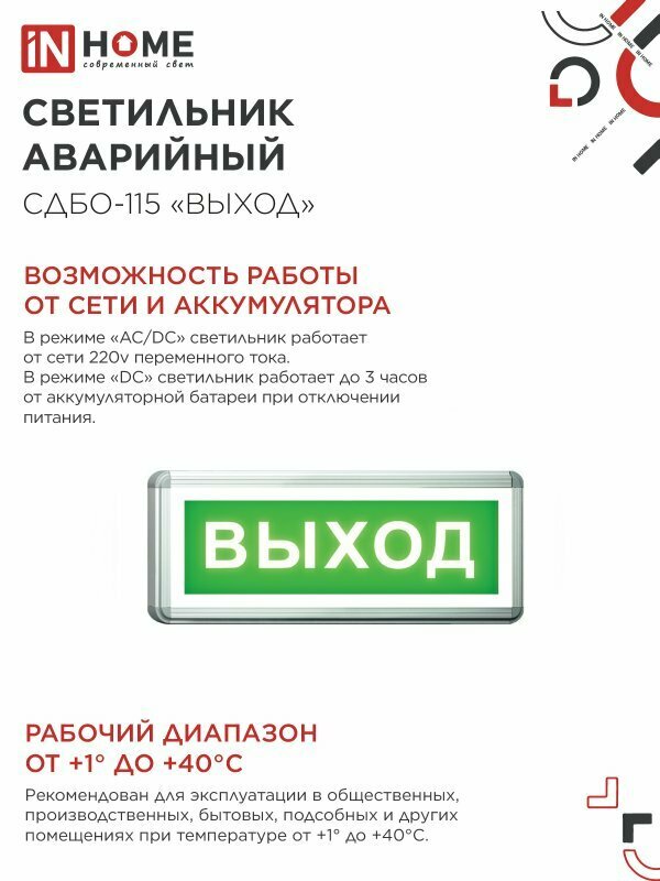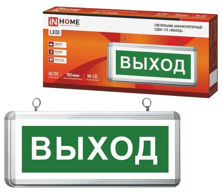 Отзывы на Светильник светодиодный аварийный СДБО-115 "выход" 3 часа NI-CD AC/DC односторонний IN HOME