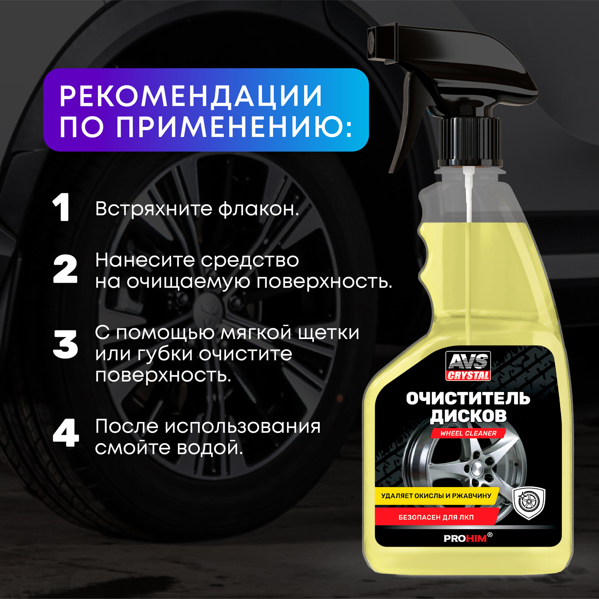 | Способ применения | Концентрат разбавить водой в соотношении 1:2-1:5 (из расчета 200-500 г/л) в зависимости от загрязнения. Перед нанесением средства основную грязь с колес смыть водой. Готовый раствор распылить на обрабатываемую поверхность, оставить на 1-3 минуты. Сильно въевшуюся грязь удалить с помощью щетки или губки. Смыть водой. |