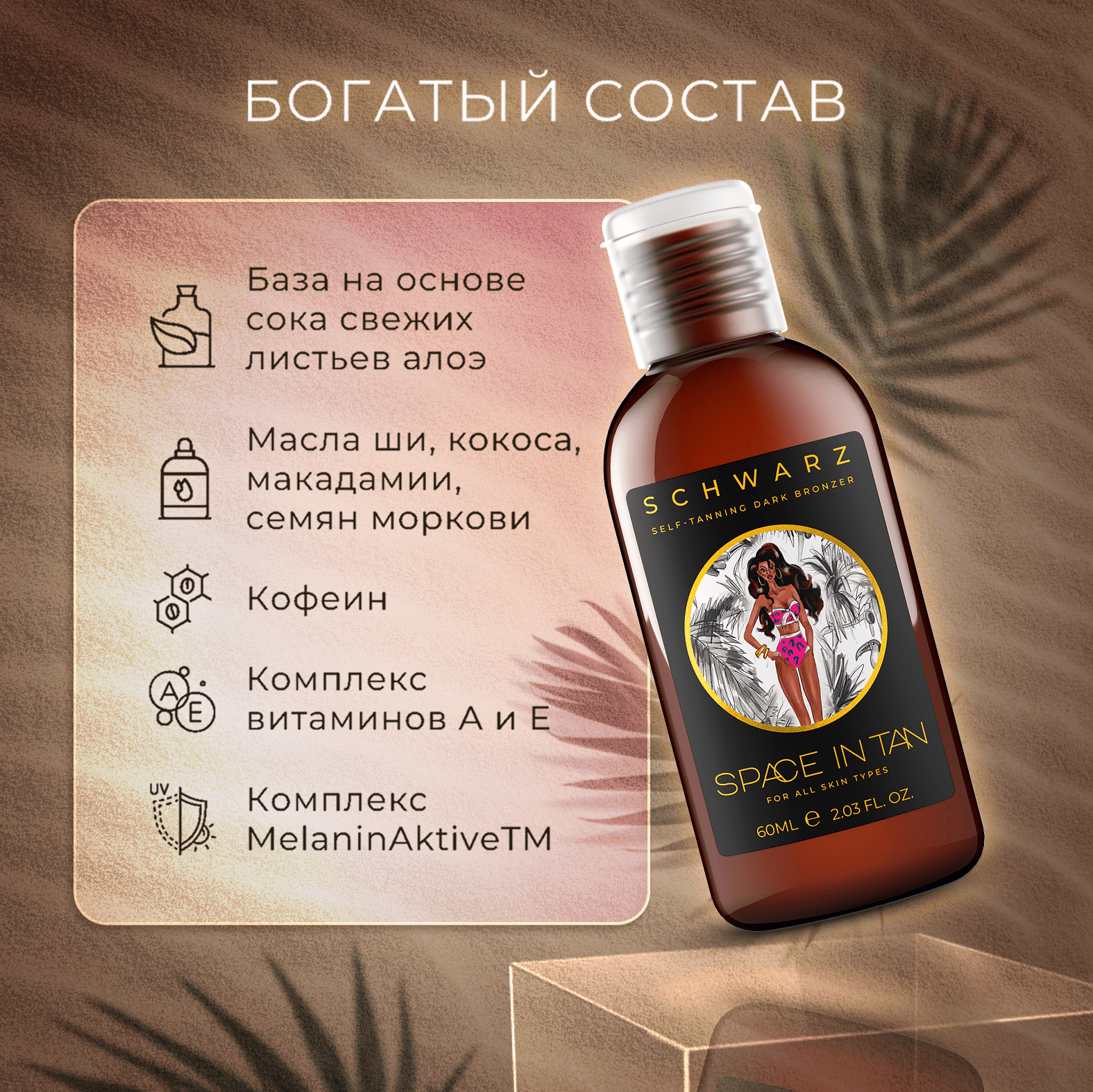 | Состав | Aloe Barbadensis Leaf Juice (Экстракт алоэ), Caprylic/Capric Triglyceride, Glycerin, Dihydroxyacetone, Butyrospermum Parkii Oil (Масло Ши), Aqua, Cocos Nucifera Oil (Масло кокосовое), Cyclomethicone, Macadamia Ternifolia Seed Oil (Масло макадамии), Isopropyl Palmitate, Retinyl Palmitate (Витамин А), Melanin (Меланин), Ascorbyl Palmitate (Аскорбил пальмитат), Juglans Regia Seed Oil (Масло грецкого ореха), Caffeine (Кофеин), Tocopheryl Acetate (Витамин Е), Erythrulose (Эритрулоза), Hippophae Rhamnoides Extract (Экстракт облепихи), Citric Acid, Cetearyl Alcohol, Sodium Acrylate/Sodium Acrylamidomethylpropane Sulfonate Copolymer, Parfum, Phenoxyethanol, Methylparaben, Ethylparaben, Propylparaben, DMDM Hydantoin, Caramel, CI 20285 |