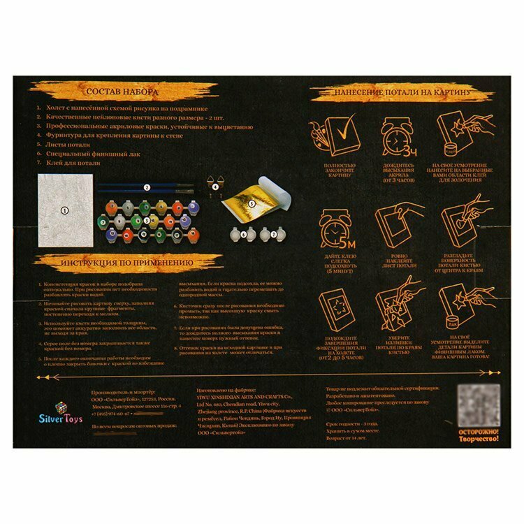 | Комплектация | холст из натурального хлопка на деревянном подрамнике (холст предварительно прогрунтован), 2 нейлоновые кисти разного размера, профессиональные акриловые краски (устойчивые к выцветанию), поталь (5 листов), финишный лак, фиксатор для потали. |