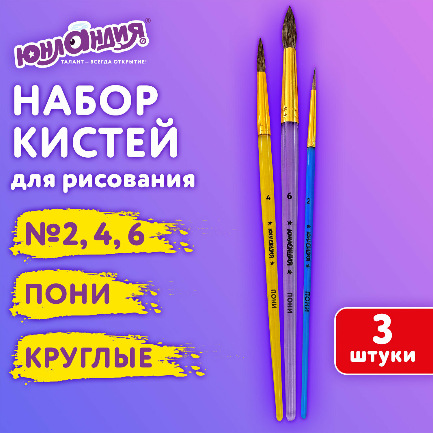 Кисти для рисования в школу набор 3 штуки, кисточки круглые № 2 4 6, пони, Юнландия, 201068 информация: