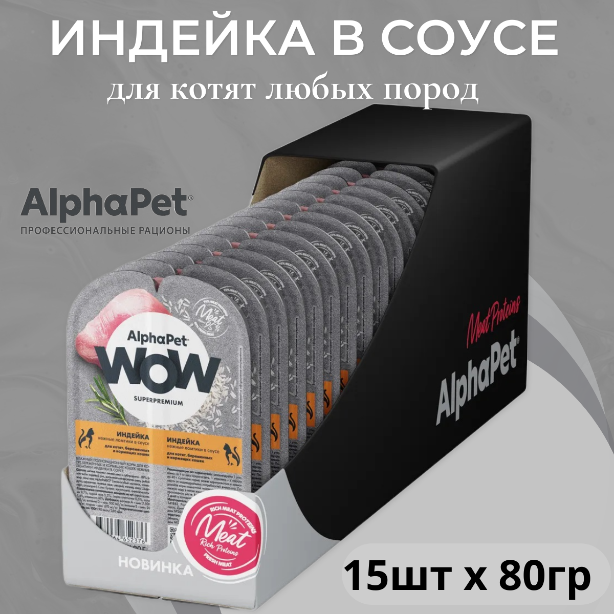 Влажный полнорационный корм для котят, беременных и кормящих кошек индейка в соусе AlphaPet WOW Superpremium 80г (Упаковка 15 блистеров)