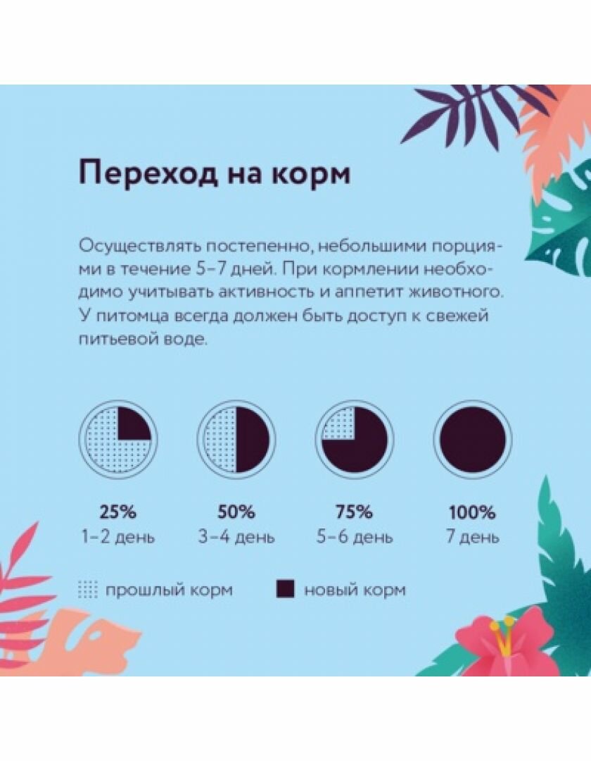 | Дозировка | Суточная норма может варьироваться в зависимости от возраста, комплекции и уровня активности вашего питомца. Не забывайте своевременно пополнять миску свежей питьевой водой. |