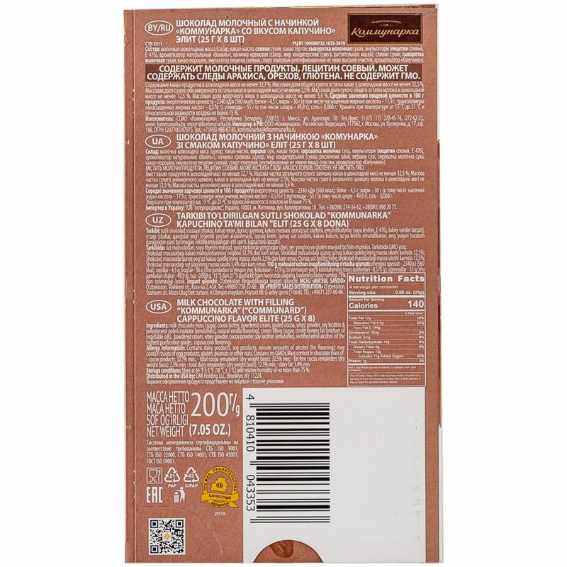 Шоколад Коммунарка молочный c начинкой со вкусом капучино элит порционный, 200 г информация:
