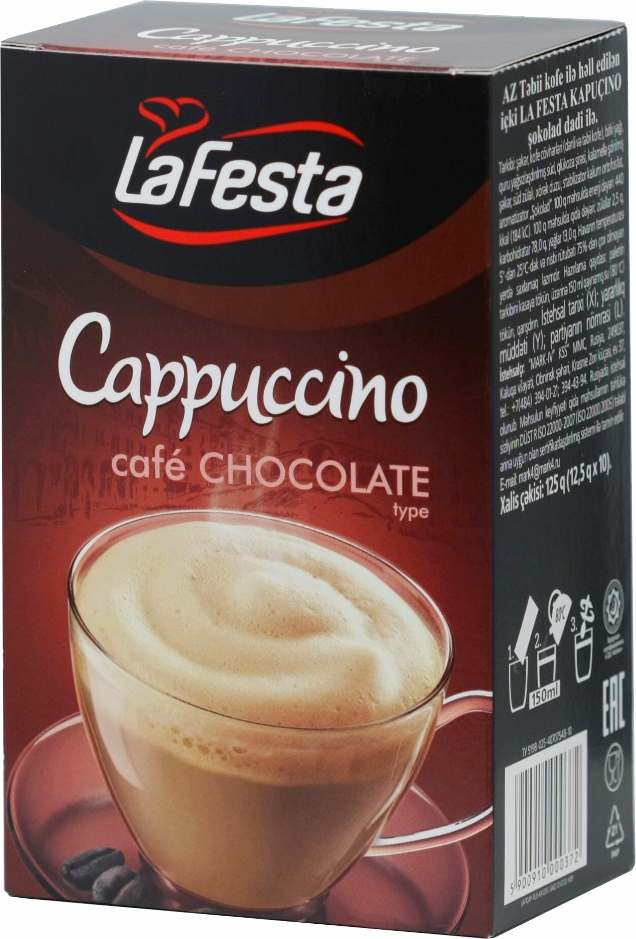 Капучино La Festa со вкусом шоколада, напиток растворимый с натуральным кофе, 125 г (12,5 г х 10 шт) информация: