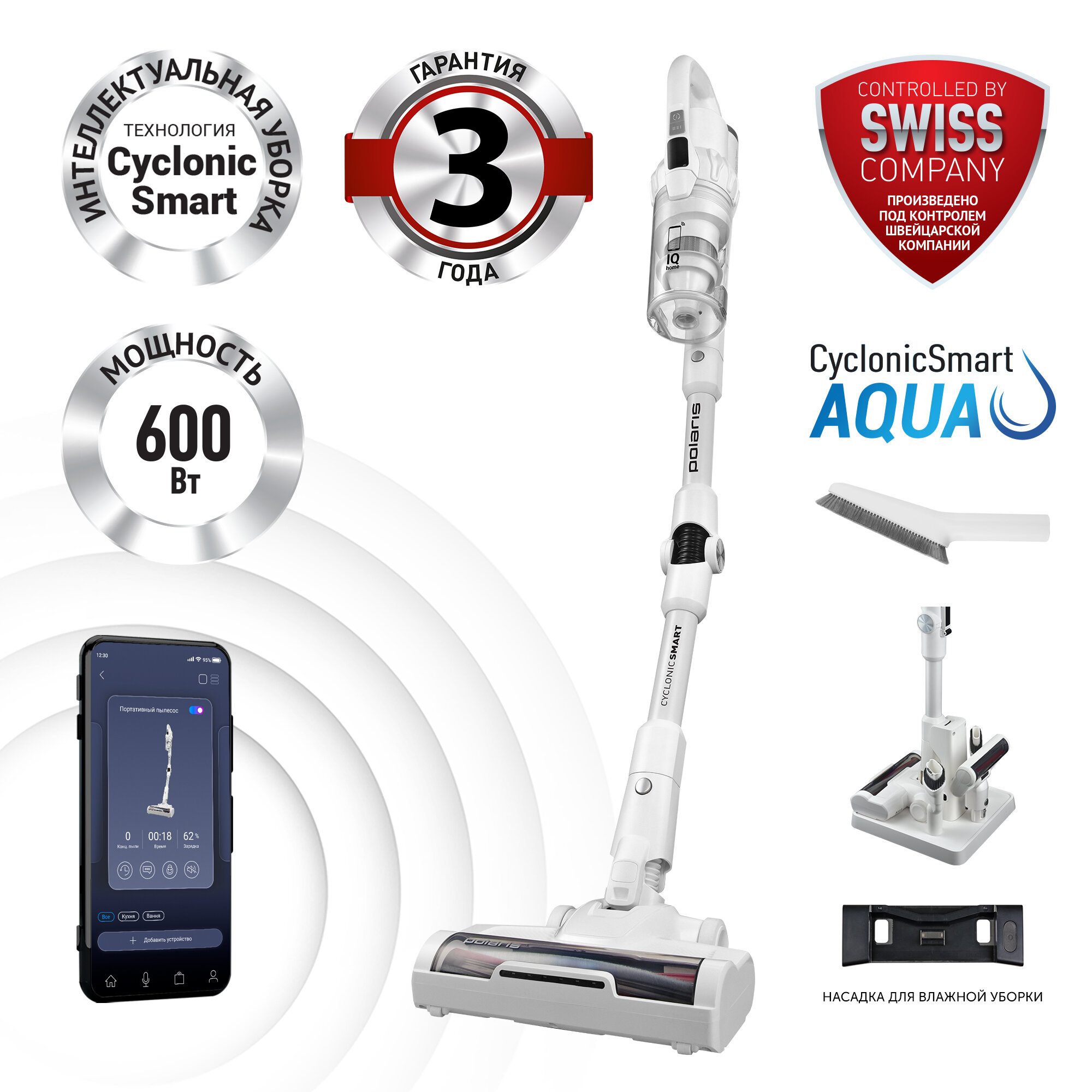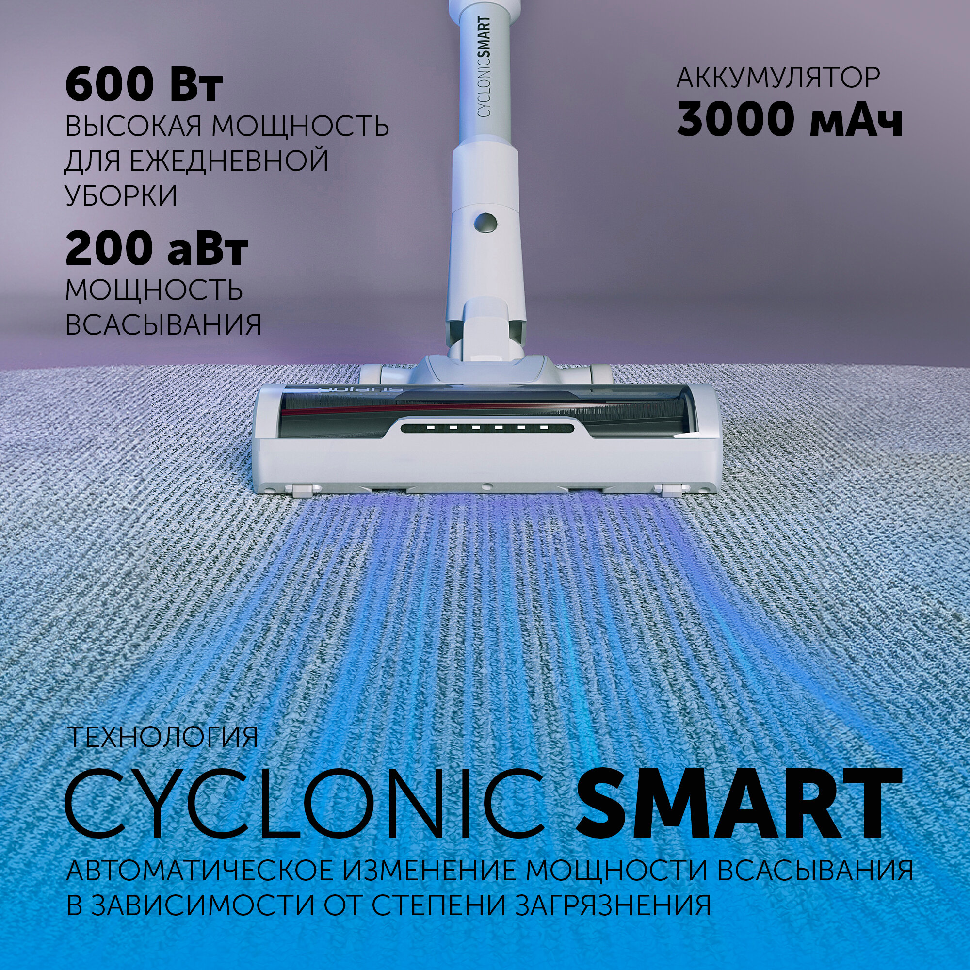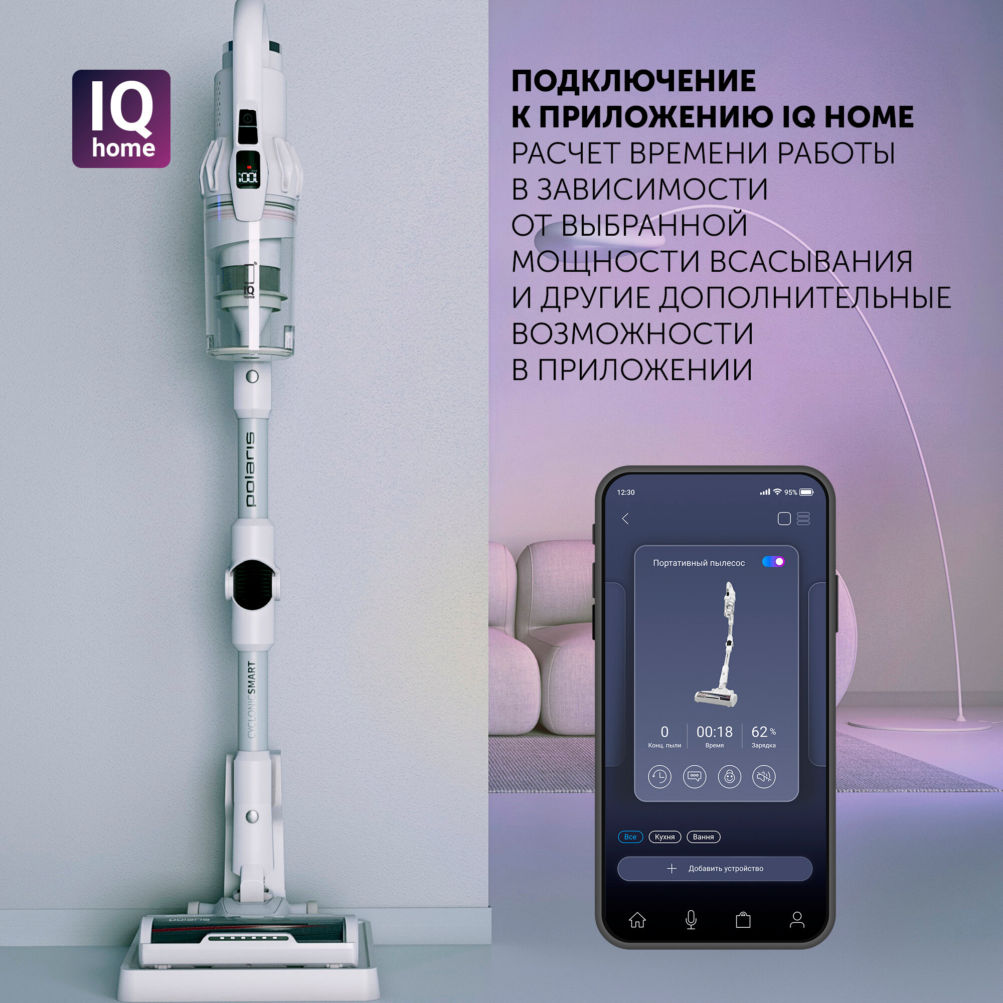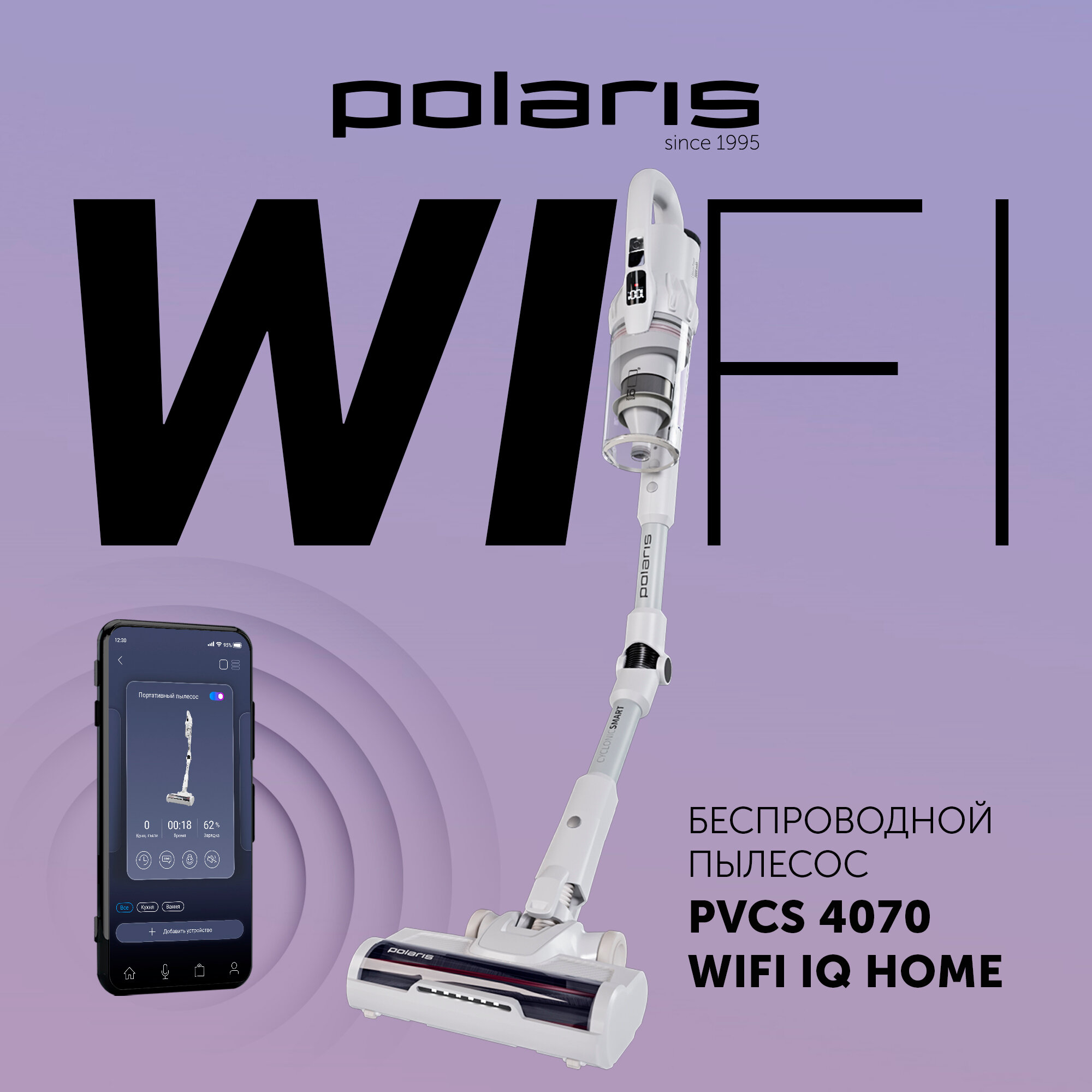 Беспроводной вертикальный пылесос Polaris PVCS 4070 Wi-Fi IQ Home, Белый информация: