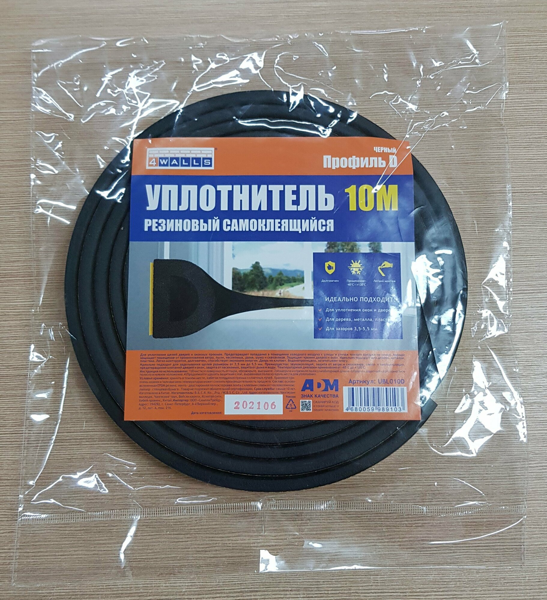 Уплотнитель самоклеящийся D-профиль 9*8 мм, черный, 10 метров . Утеплитель для дверей и окон. 4WALLS информация: