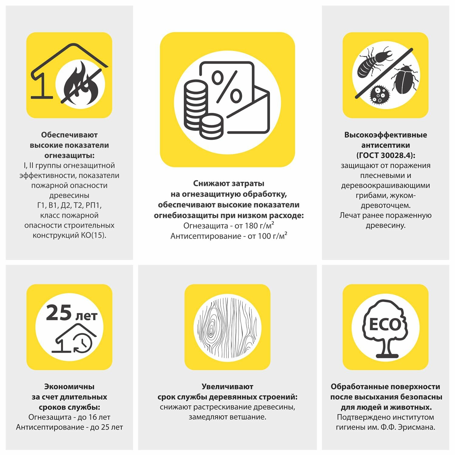 | Особенности | без запаха, быстросохнущая, для использования в бане/сауне, морозостойкая, невымываемая, с антисептиком, с огнебиозащитой, с огнезащитой, огнезащитный |