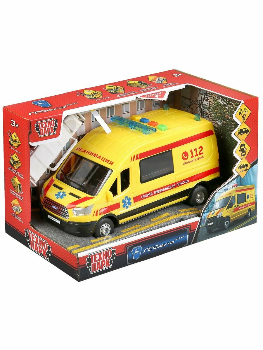 Машина пластик свет-звук Форд Транзит Реанимация, 22,5 см. 4 кнопки Технопарк TRANSITVAN-22PLAMB-YE (36) (36