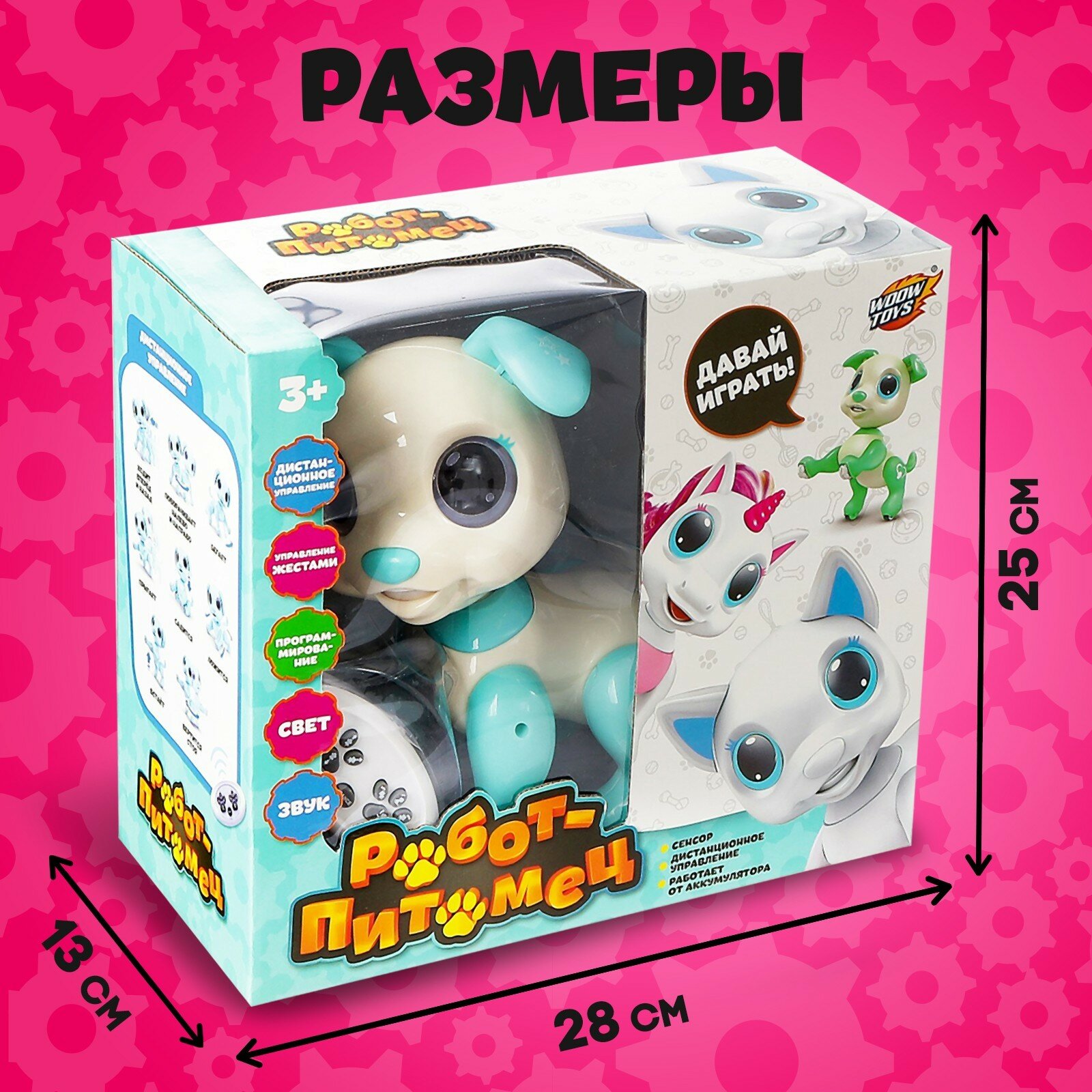 | Комплектация | робот, пульт ДУ, 6 электронных "косточек", usb-провод для зарядки, миска для косточек |