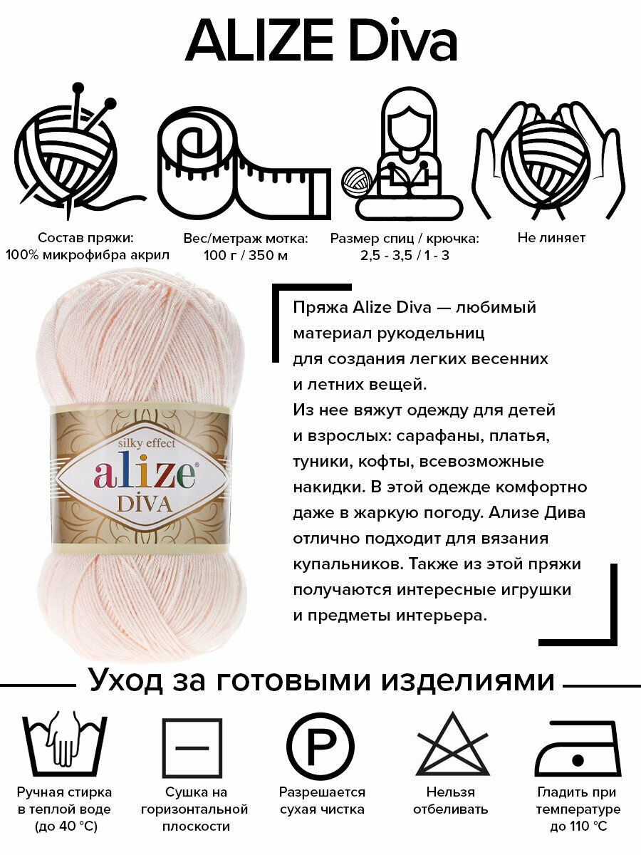 Пряжа Alize Diva Молочный (62) 1 моток 100 г/350 м (100% микрофибра) ализе дива 330 ₽