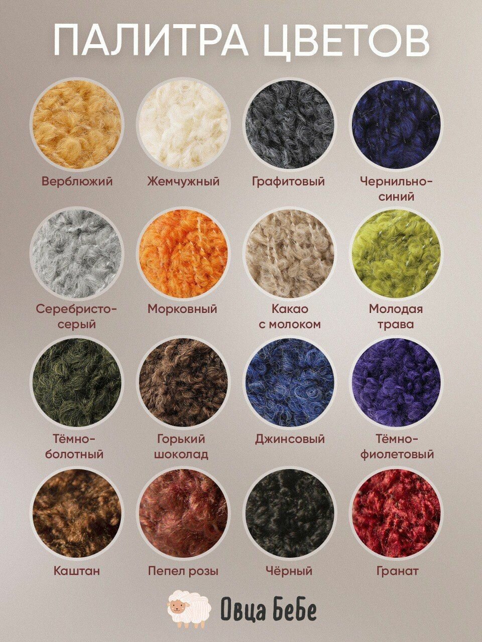 | Цвет товара | Джинсовый, верблюжий, гранат, графитовый, графитовый серый, жемчужный, какао с молоком, каштан, молодая трава, морковный, серебристо-серый, темно-фиолетовый, чернильный, шоколад |