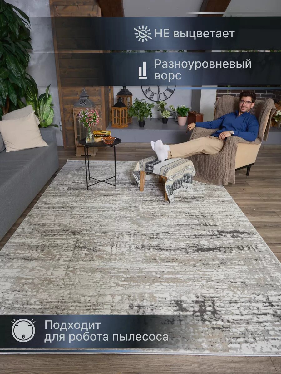 Ковер "Cream-Grey" из Турции, прямоугольный (150x200) в гостиную, зал, спальню, кухню, прихожую, кабинет и комнату
