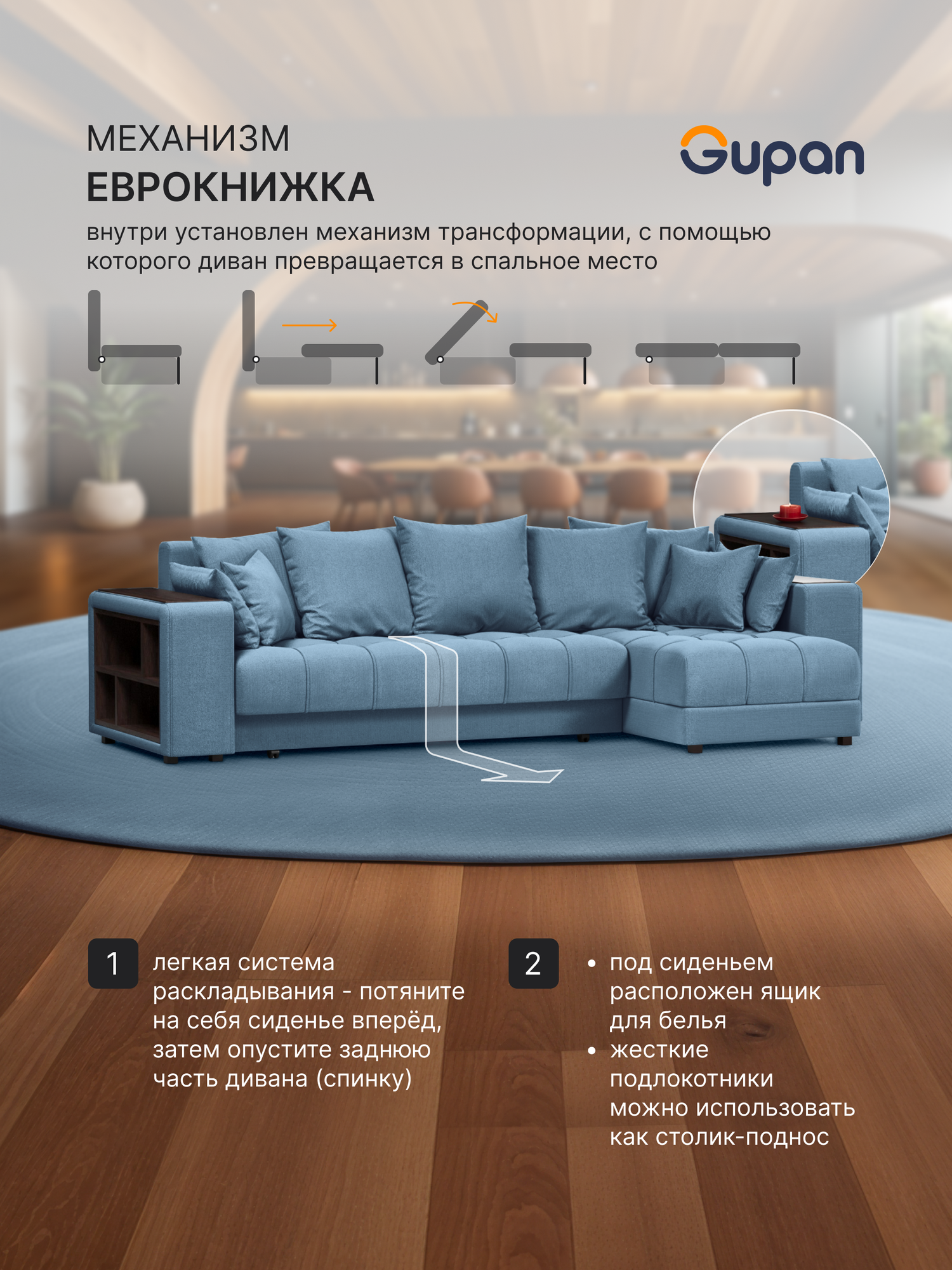 Отзывы на Диван угловой Gupan Дубай Велюр Amigo Blue, раскладной, механизм еврокнижка, беспружинный, с ящиком для белья