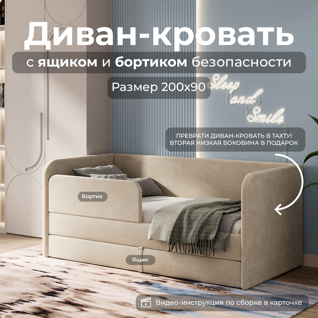 Детский диван кровать Lucky 200х90 см, цвет Бежевый, кровать диван от 3 лет с бортиками и выкатным ящиком, тахта кровать односпальная подростковая информация: