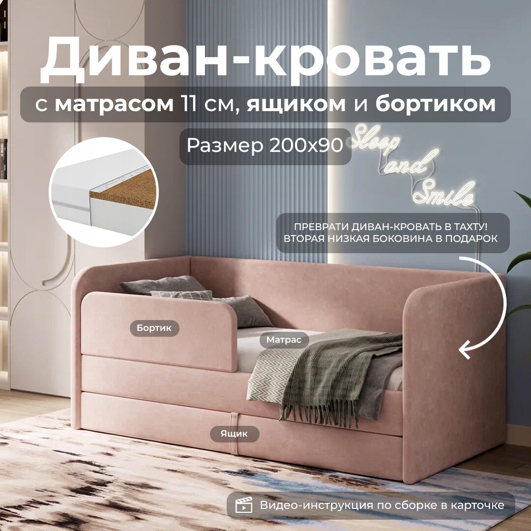 Отзывы на Детский диван кровать Lucky с матрасом 200х90 см, цвет Розовый, кровать диван от 3 лет с бортиками и выкатным ящиком, тахта кровать софа односпальная