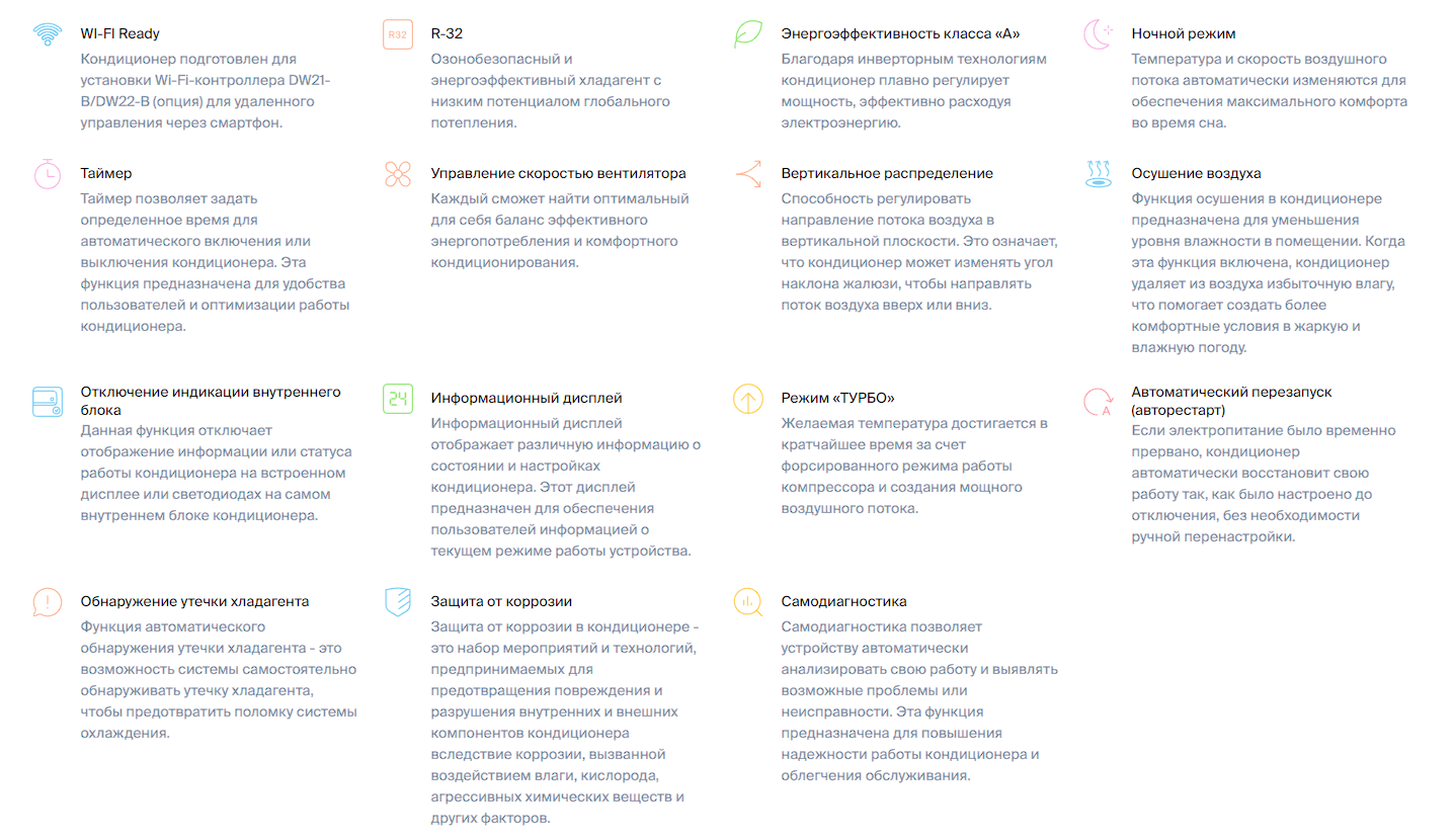 | Особенности | дисплей / индикация работы / пульт ДУ / регулировка направления воздушного потока / таймер включения/выключения / управление со смартфона |