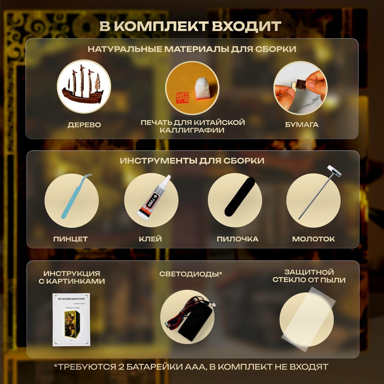 | Комплектация | Материалы для сборки / пинцет / клей / пилочка / инструкция / светодиоды |