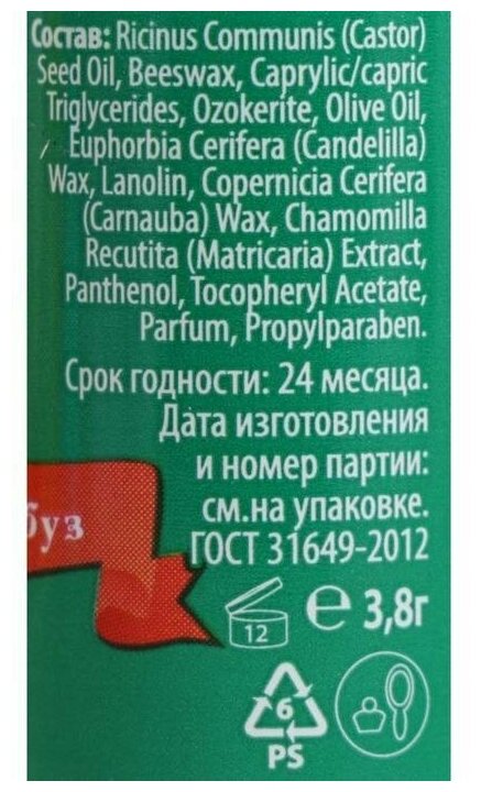 | Состав | ricinus communis oil, cera alba, olive oil, caprylic/capric triglyceride, ozokerite, candelilla cera, cera carnauba, lanolin oil, chamomilla recutita extract, tocopheryl acetate, pantenol, propylparaben, parfum |