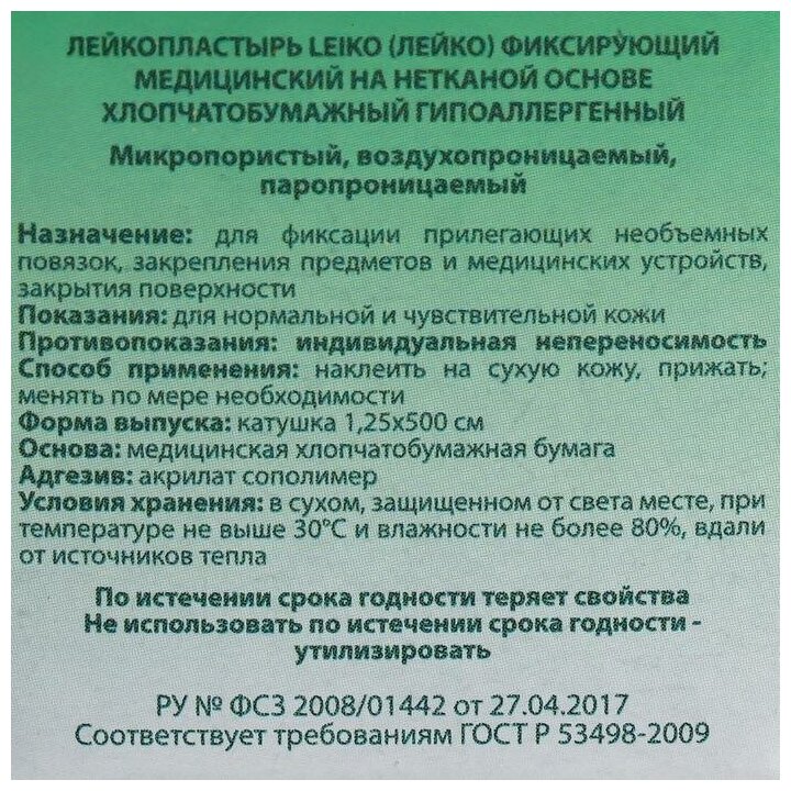 10 цен на Пластырь фиксирующий Leiko plaster 1.25х500 см нетканая основа