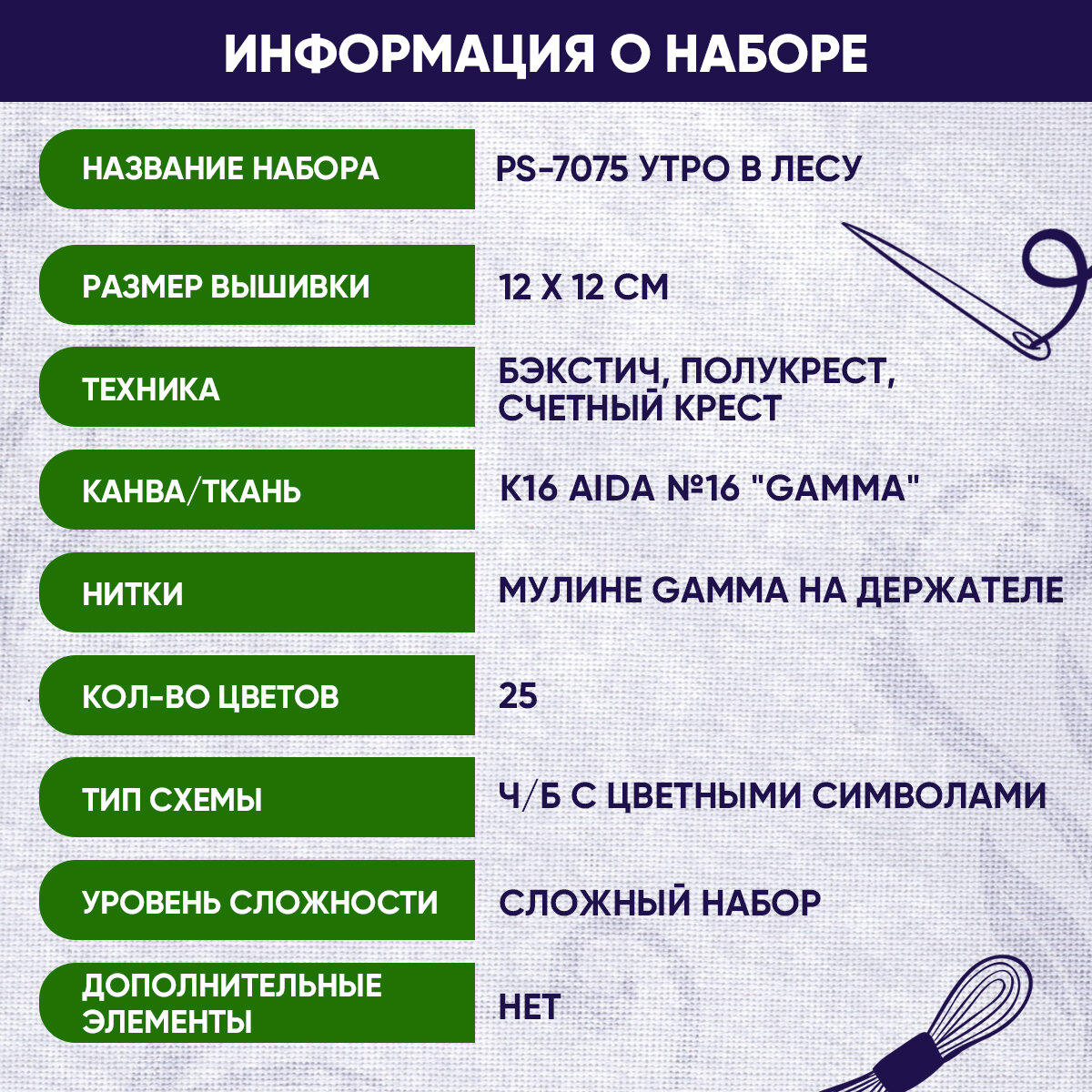 | Дополнительная информация | Рисунок на канве: не нанесён , сложность: 3 |