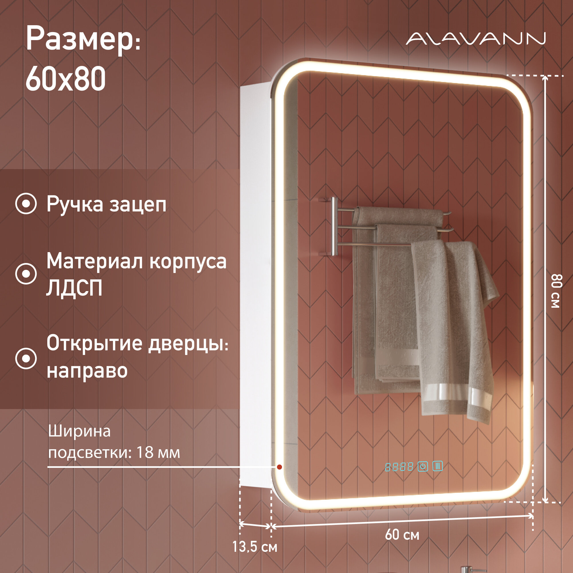 10 цен на Зеркало-шкаф для ванной Alavann Lana Plus 60 см, LED подсветка, с сенсорным выключателем, антизапотевателем, часами, холодный свет, белый