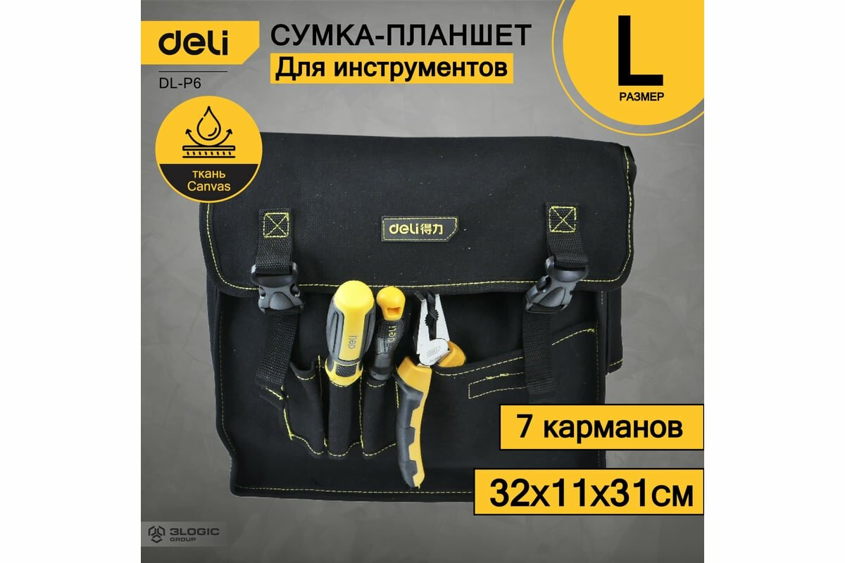 10 цен на Сумка-планшет для инструментов DELI DL-P6 320x110x310мм (7 карманов, плечевой ремень, ткань канвас) 130330