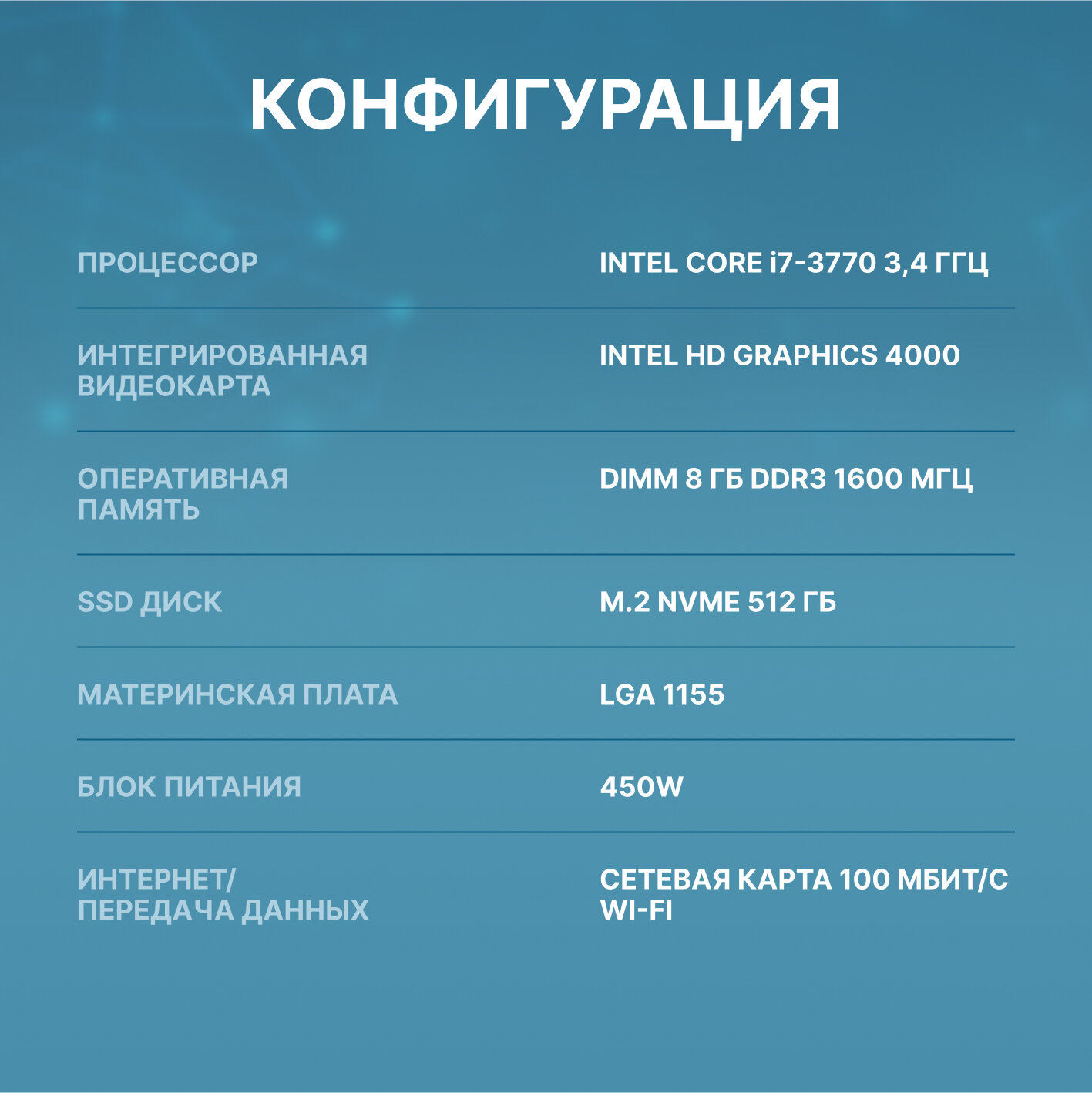 Системный блок AURORA ПК Office FL forza Компьютер офисный (Intel Core i7-3770 (3.4 ГГц), RAM 8 ГБ, SSD 512 ГБ, Intel HD Graphics 4000, Windows 10 Pro), чёрный матовый информация: